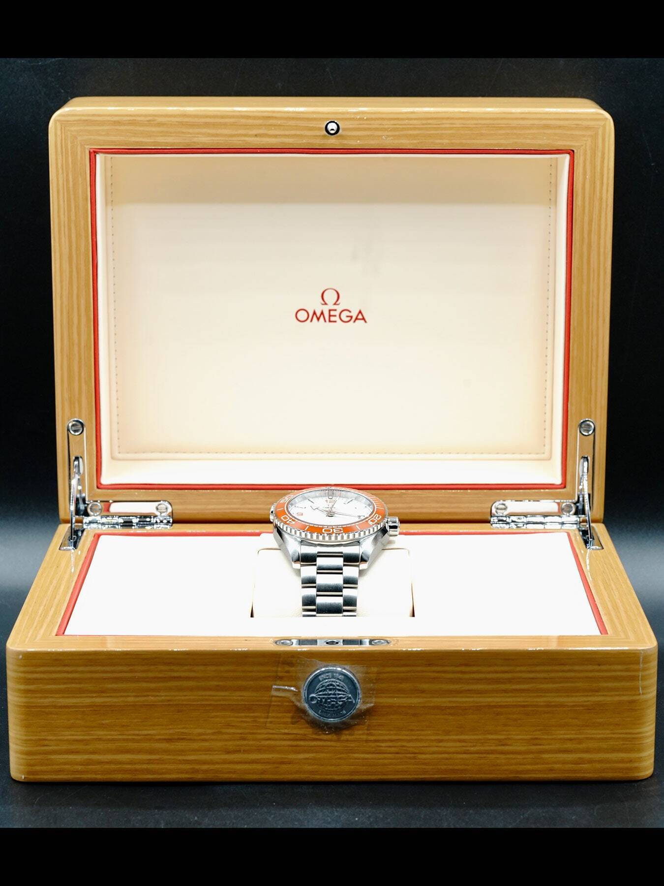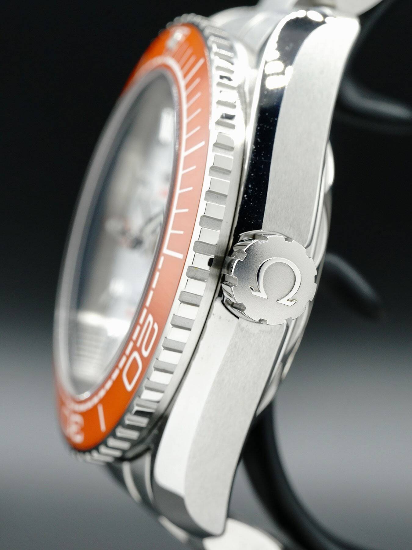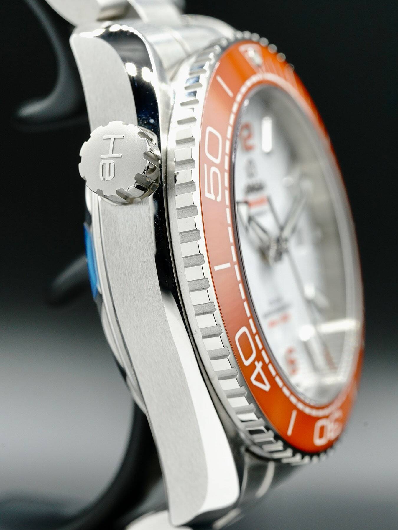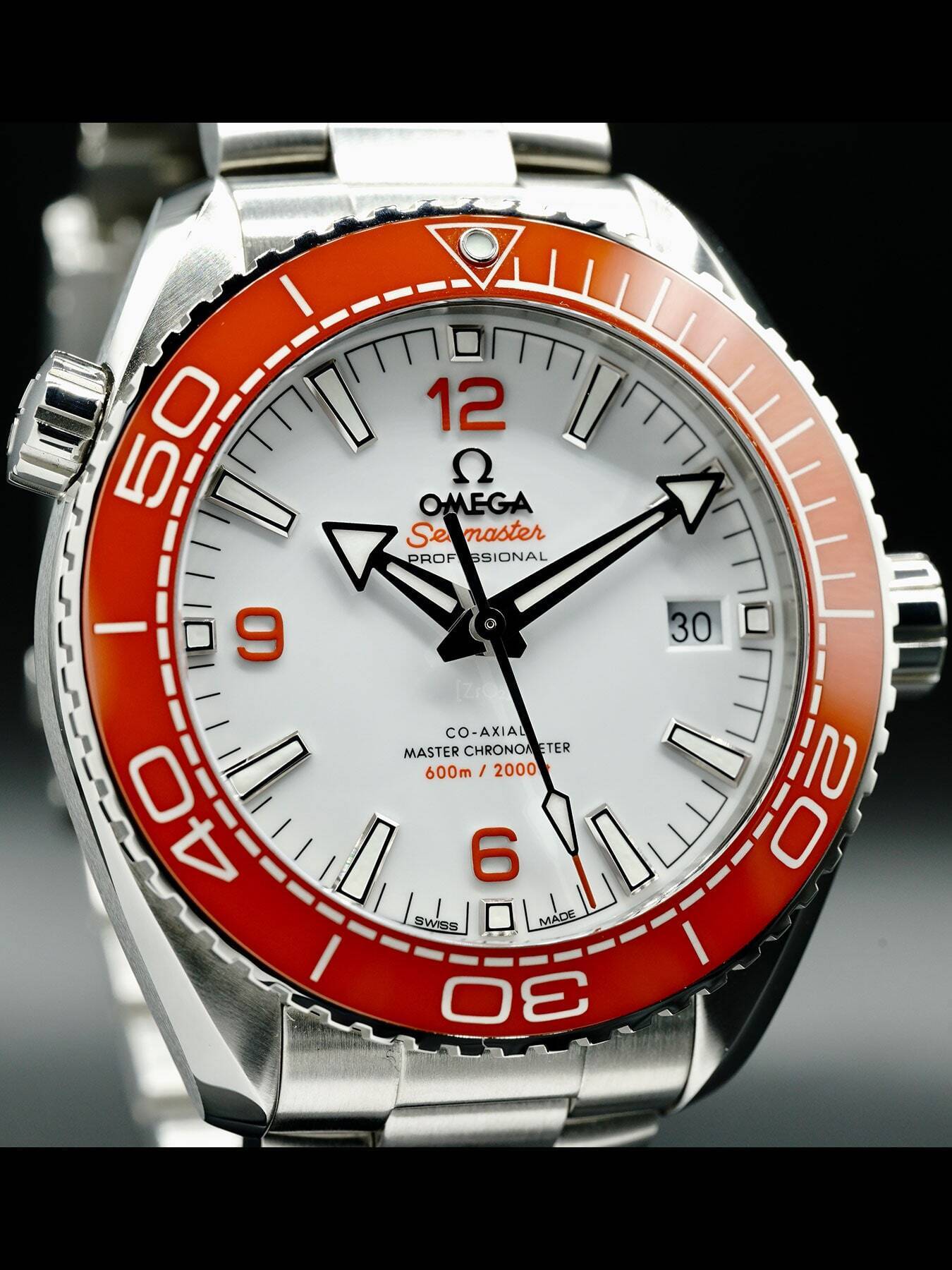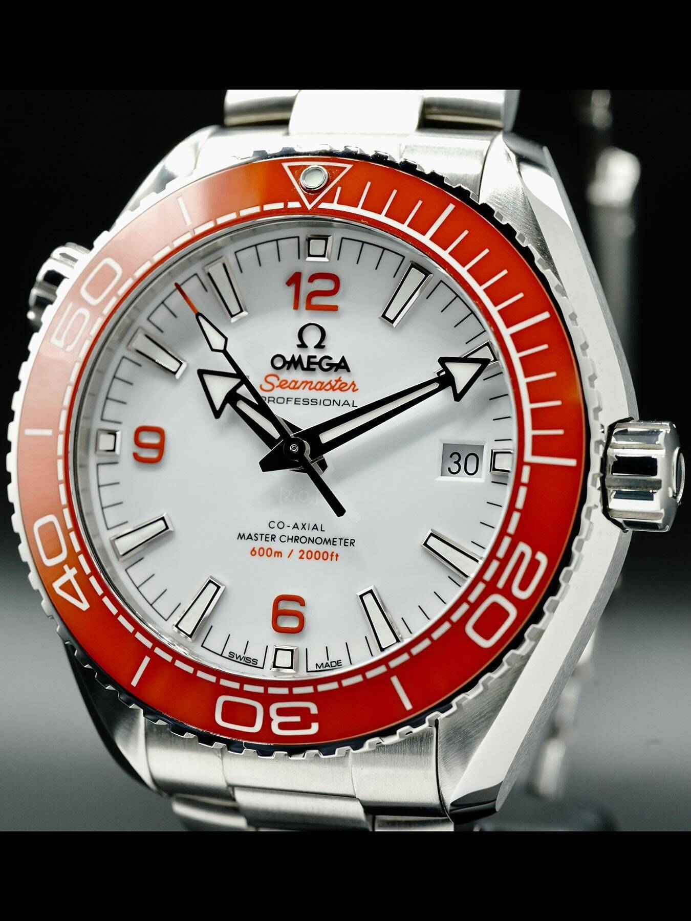 This Omega Seamaster Planet Ocean 600M Master Chronometer features a 43.5mm stainless steel case with an orange ceramic bezel on a stainless steel bracelet. This watch also sports a white dial with luminous hands, index dial markers, and orange Arabic numeral hour markers covered by scratch resistant sapphire crystal.