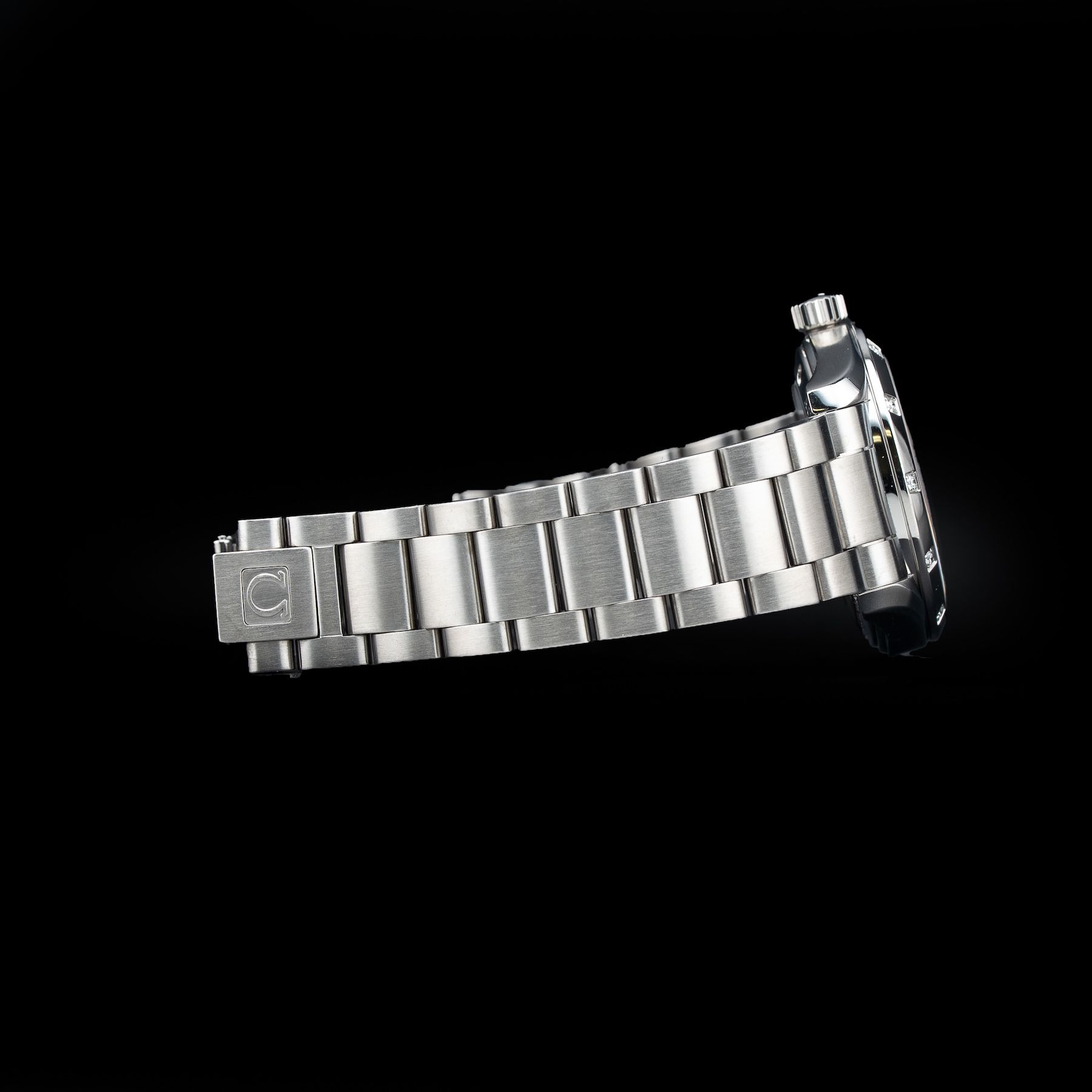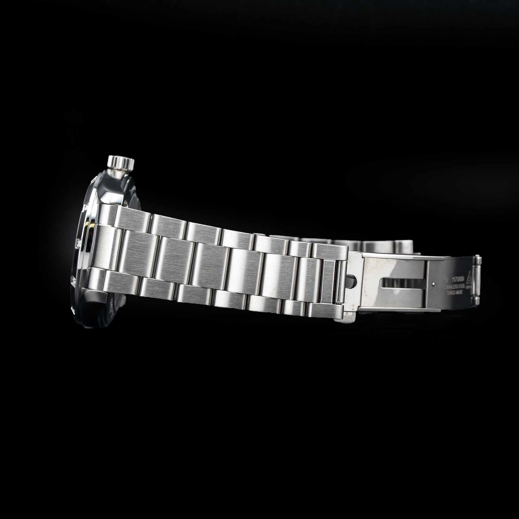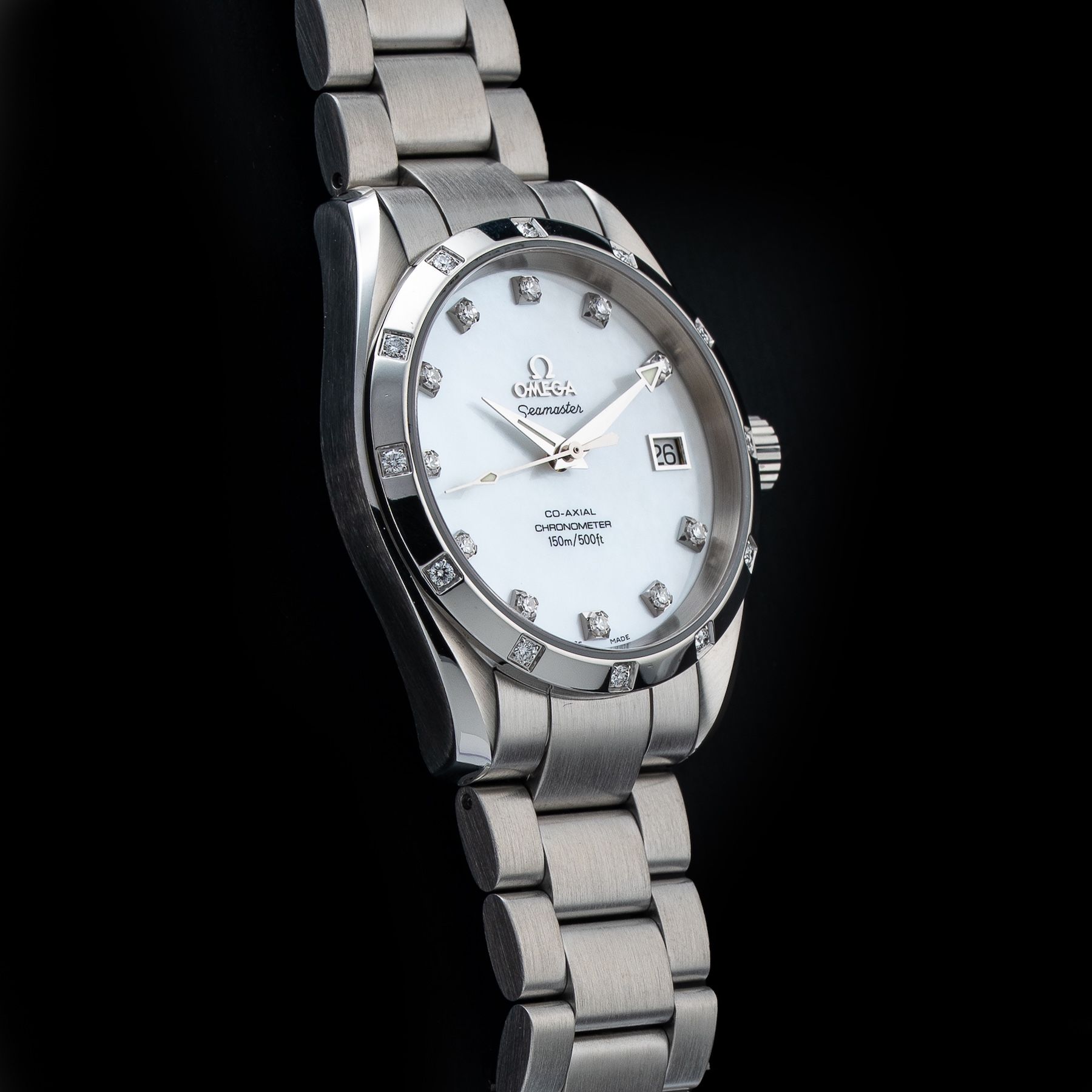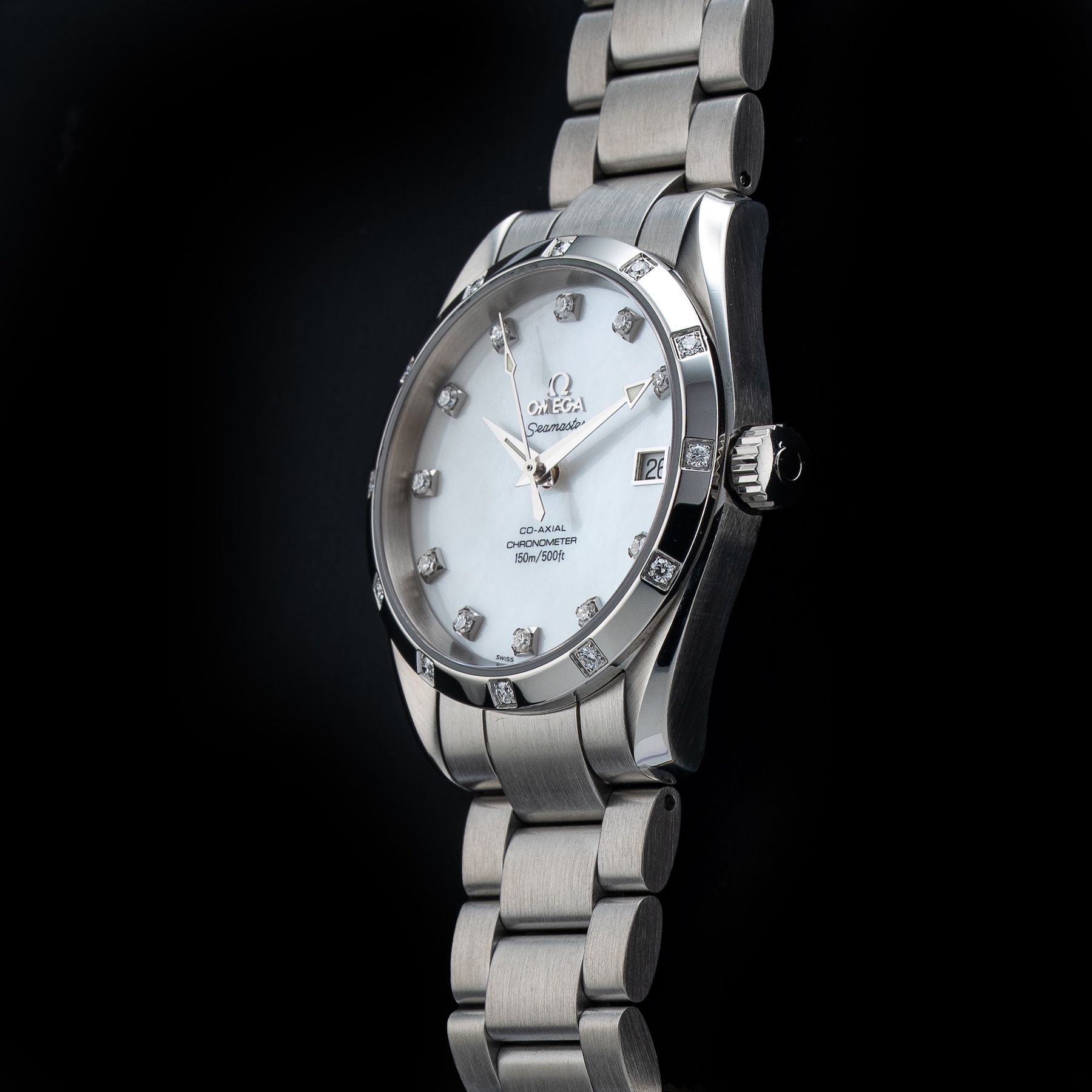 This watch features a 36.2mm steel case on steel bracelet. This watch also sports a white dial. Powered by a self-winding movement. Water resistance up to 150 meters.