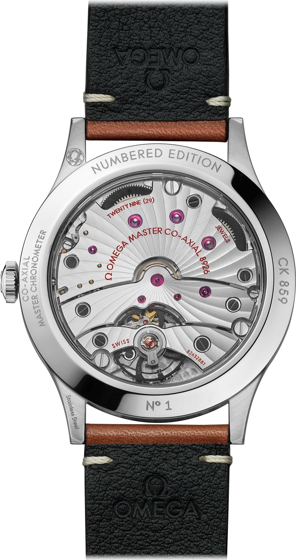 Presented on a brown leather strap with a vintage OMEGA logo on the buckle, the timepiece is driven by the manual winding OMEGA Co-Axial Master Chronometer Calibre 8926. This sits behind a polished caseback with several engravings including, “NUMBERED EDITION”, “CO-AXIAL MASTER CHRONOMETER” and “CK 859” – a historic reference to stainless steel and the shape of the case.