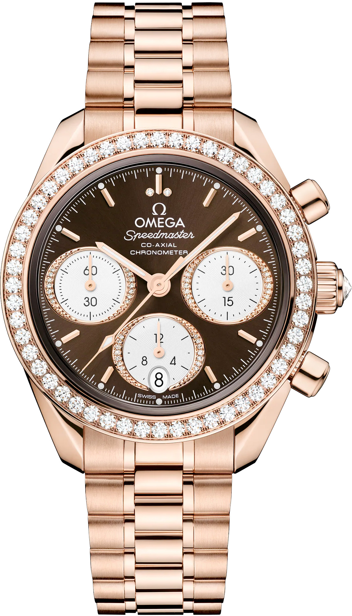 This model, cased in fully polished 18K Sedna™ Gold, has a bezel set with 52 diamonds, and a polished crown set with a single diamond.