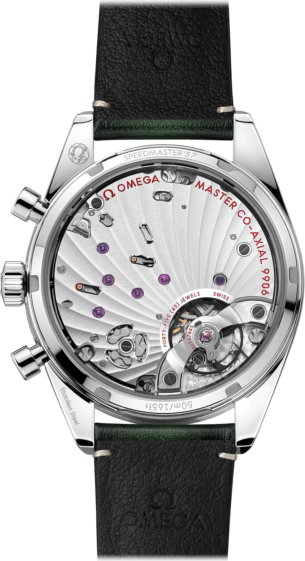 The watch is presented on a green leather strap with an OMEGA logo in postive relief on the buckle, and is driven by the manual-winding OMEGA Co-Axial Master Chronometer Calibre 9906.