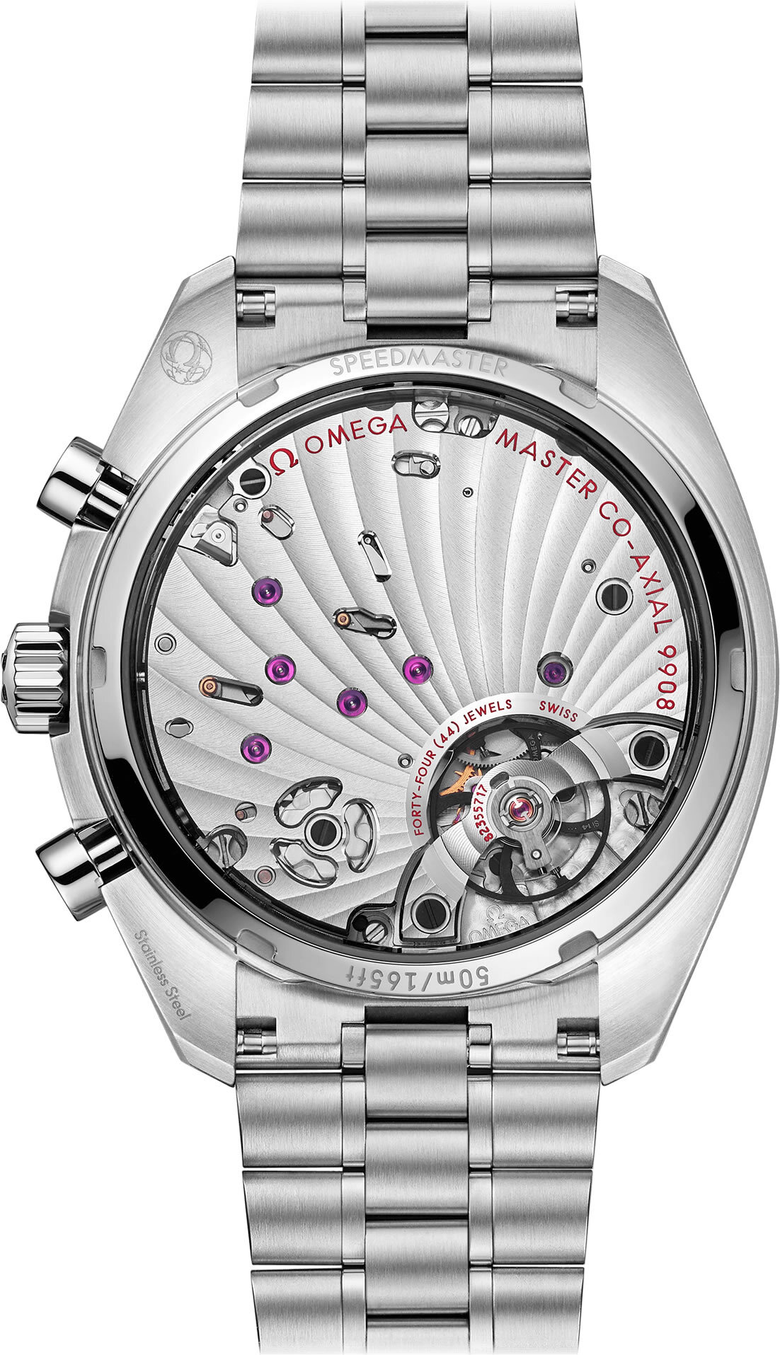 Presented on a stainless steel bracelet, the watch features a black small-seconds counter at 9H, and a black 60-minute and 12-hour recorder at 3H with red hands. Inside, the timepiece is driven by the OMEGA Co-Axial Master Chronometer Calibre 9908.