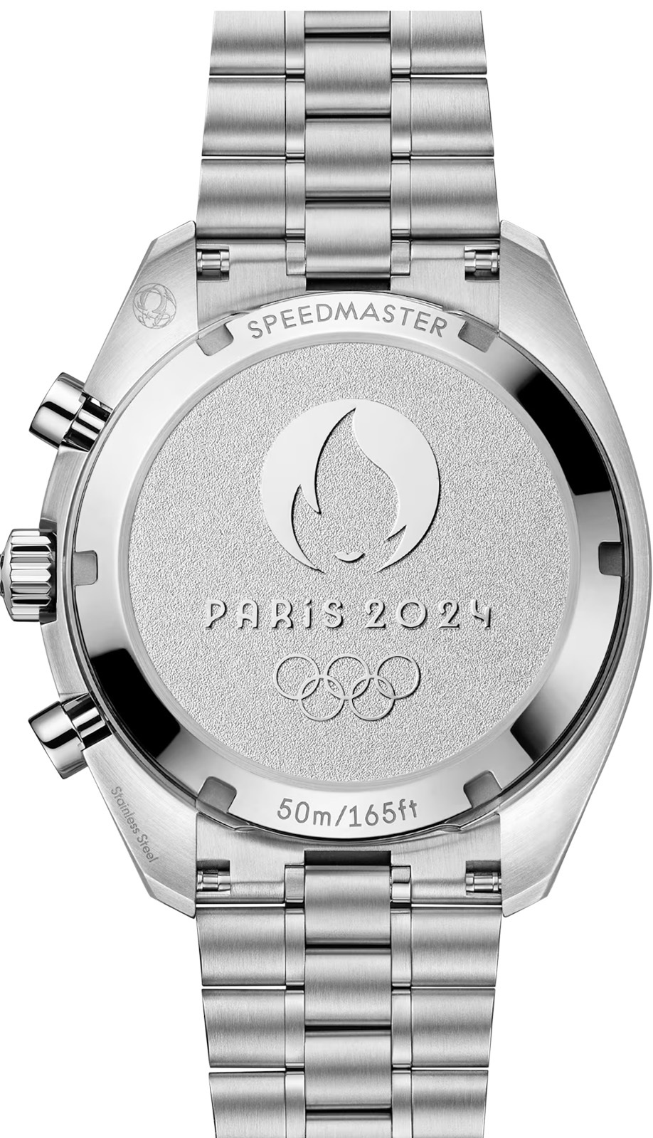 On the reverse side, the commemorative stainless steel caseback reveals a stamped medallion with a frosted base, featuring a mirror-polished Paris 2024 logo, along with the stamped words, "Paris 2024" and the Olympic Rings.
