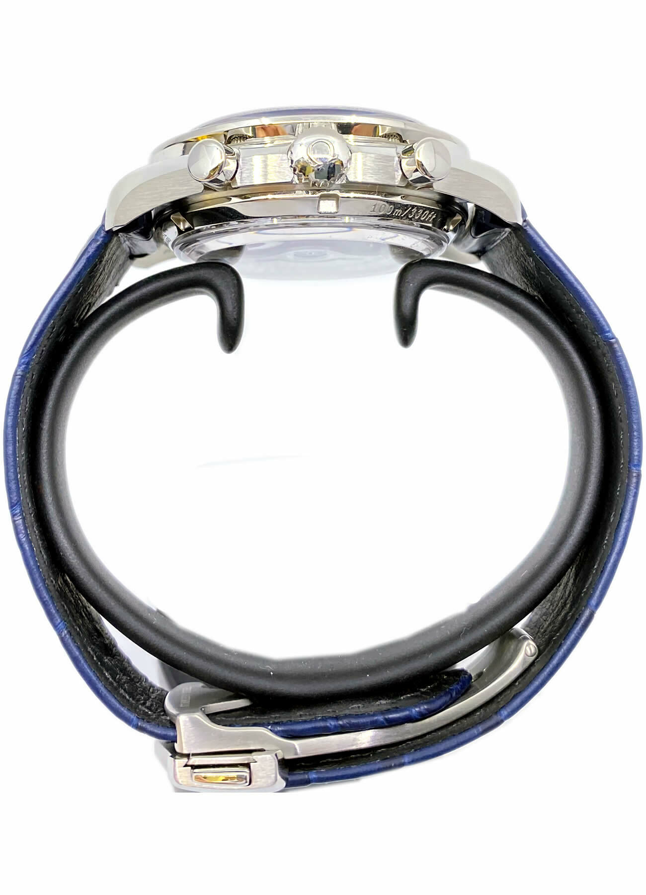 - This timepiece features a 44mm steel case paired with a high quality leather strap. It showcases a distinctive blue dial and is powered by a precise automatic winding movement. The watch is designed with a water resistance of up to 100m.