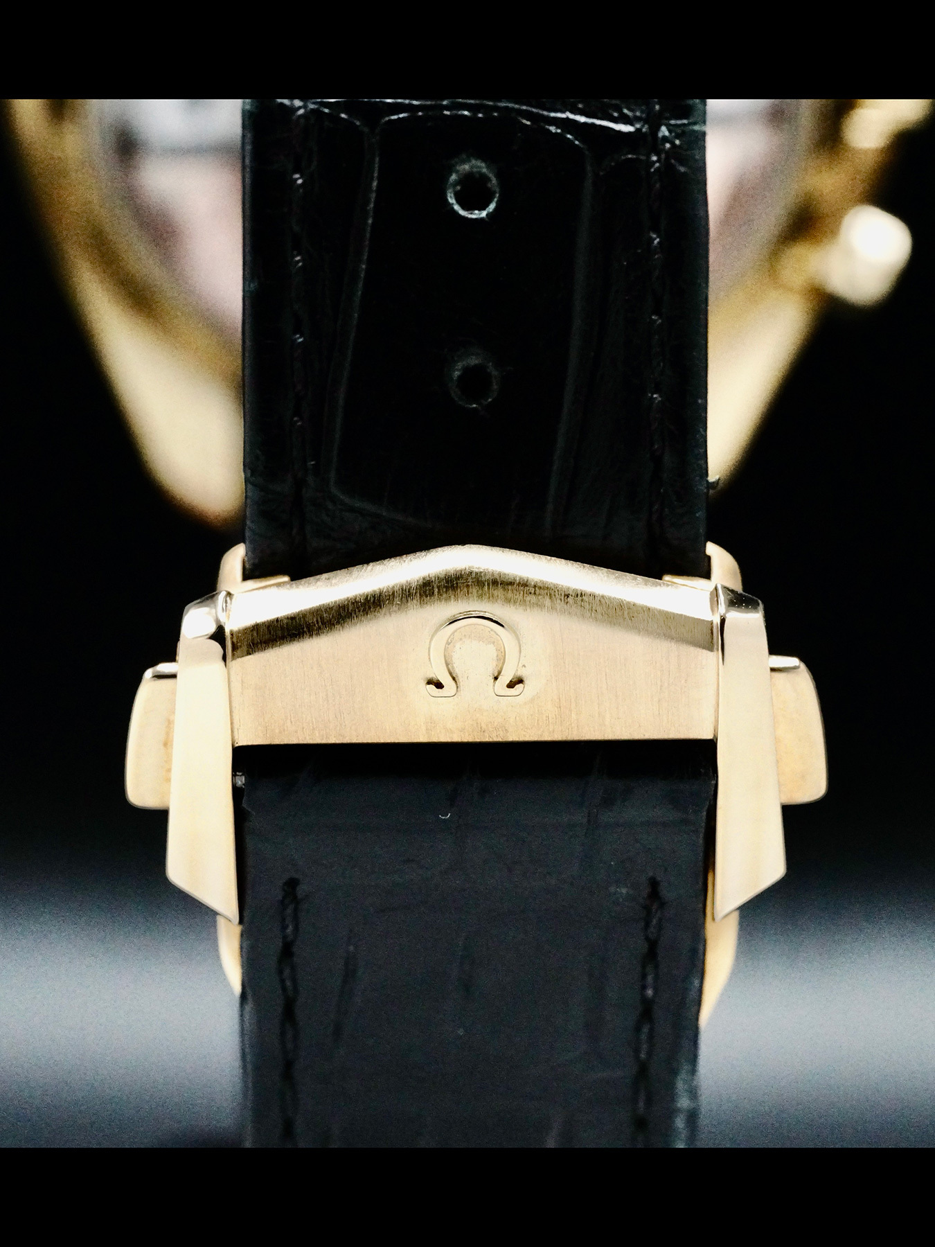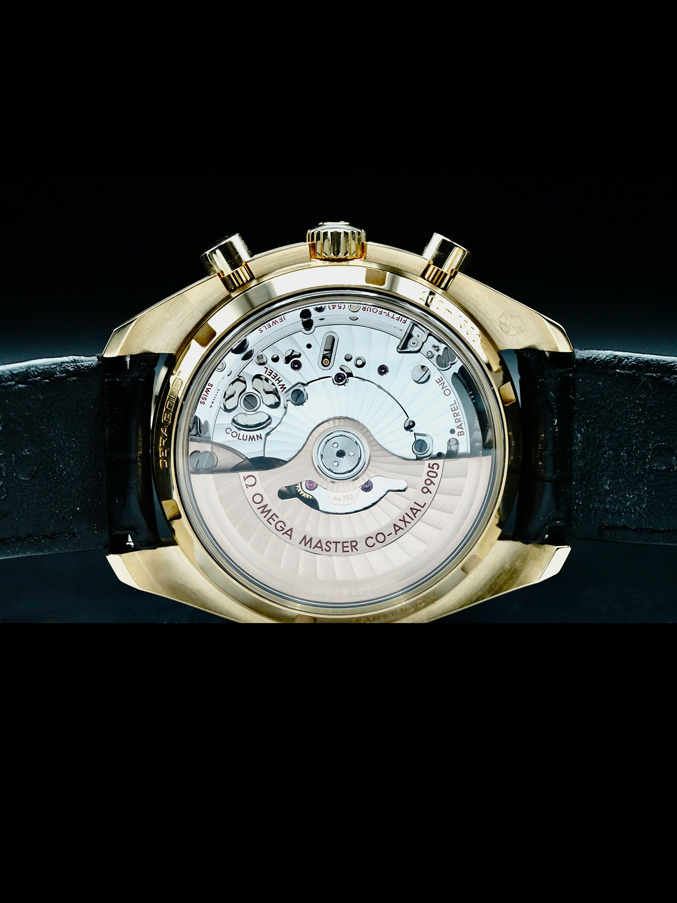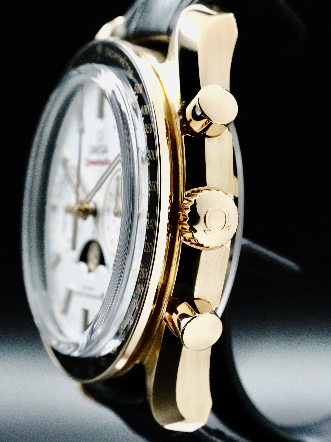 This Omega Speedmaster Moonwatch Master Chronometer Moonphase features a 44.25mm 18k yellow gold case with an exhibition case back on a black leather strap. This watch also sports a silver dial with luminous hands/index dial markers and moon phases at 6 o'clock covered by scratch resistant sapphire crystal.