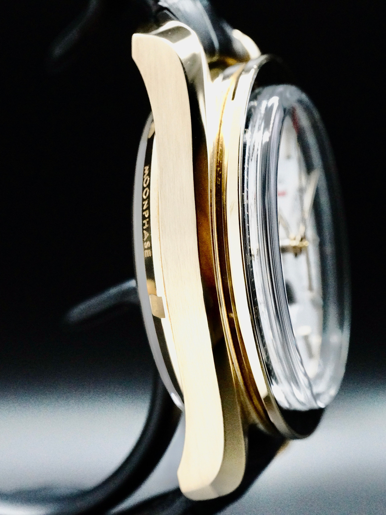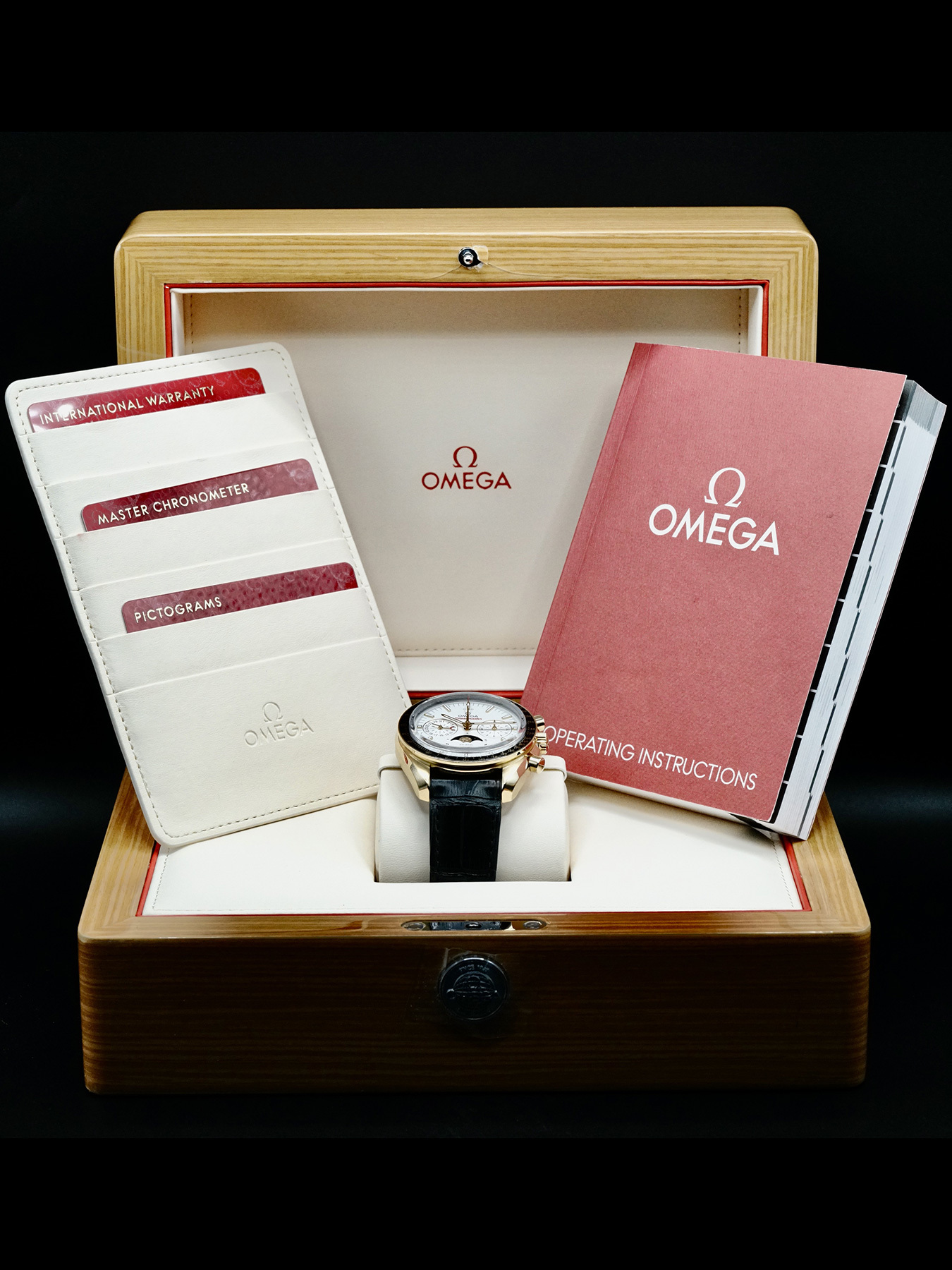 This Omega Speedmaster Moonwatch Master Chronometer Moonphase Yellow Gold 304.63.44.52.02.001 is in EXCELLENT condition. This watch includes its original box, instruction manual, and warranty card dated for 2017. This watch has been fully authenticated and certified by Exquisite Timepieces.