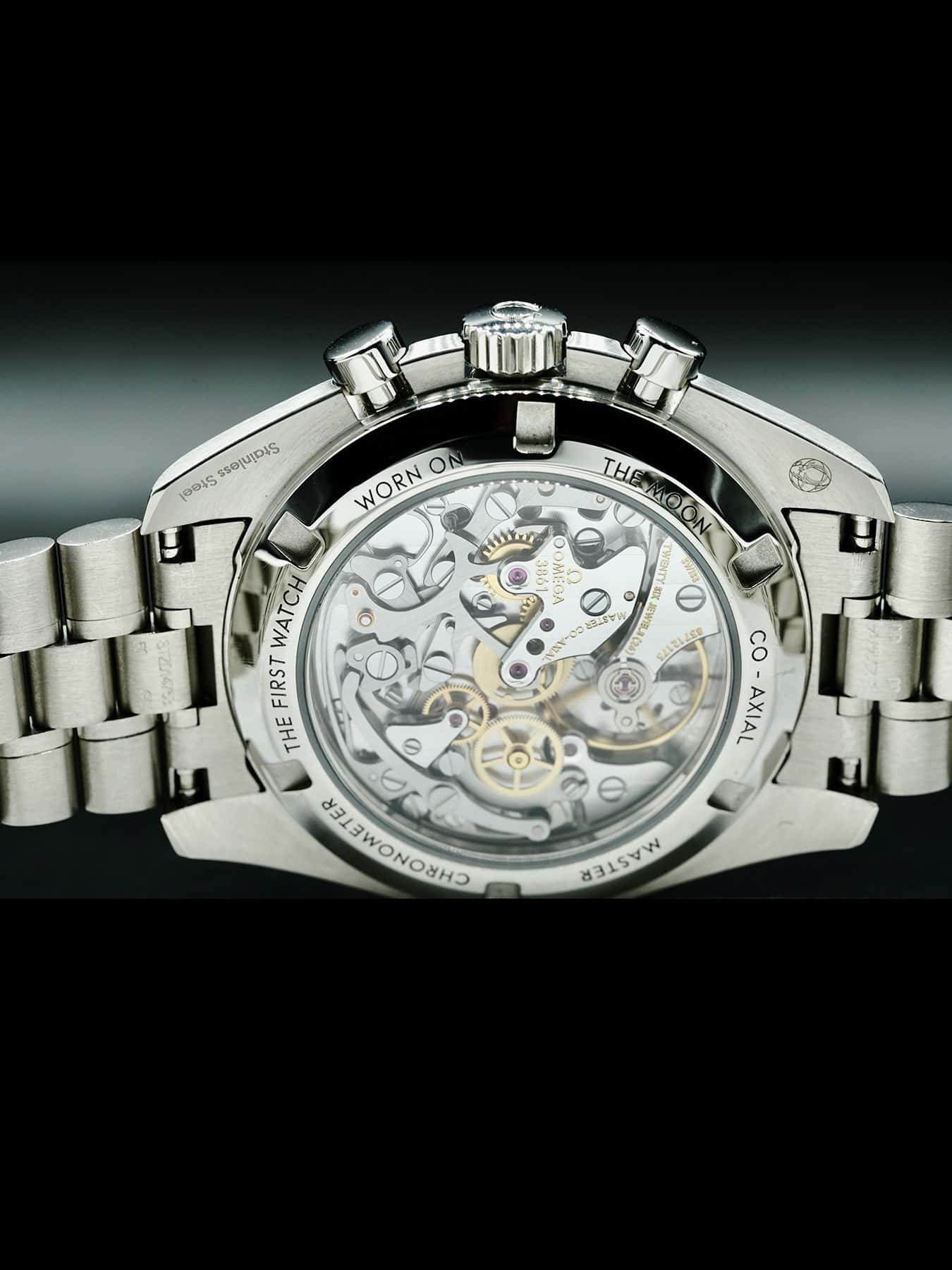 This Omega Speedmaster Moonwatch Professional Master Chronograph 310.30.42.50.01.002 features a 42mm steel case, exhitibion case back on steel bracelet. This watch also sports a black dial with luminous hands and luminous indexes, it is covered by scratch resistant sapphire crystal.