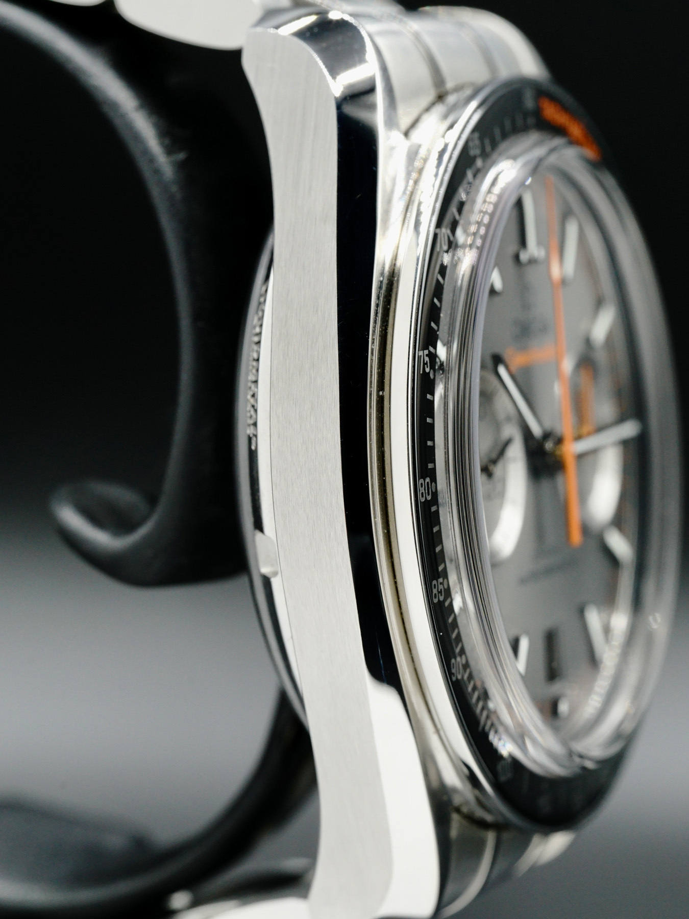 On the sun brushed grey dial, there is a distinctive racing style minute-track which gives the watch its name. There are also two subdials with rhodium plated applied rings as well as a 6 o’clock date window that blends with the colour of the dial. The hands are either blackened or varnished orange, while the arrowhead indexes are blackened with white Super-LumiNova.