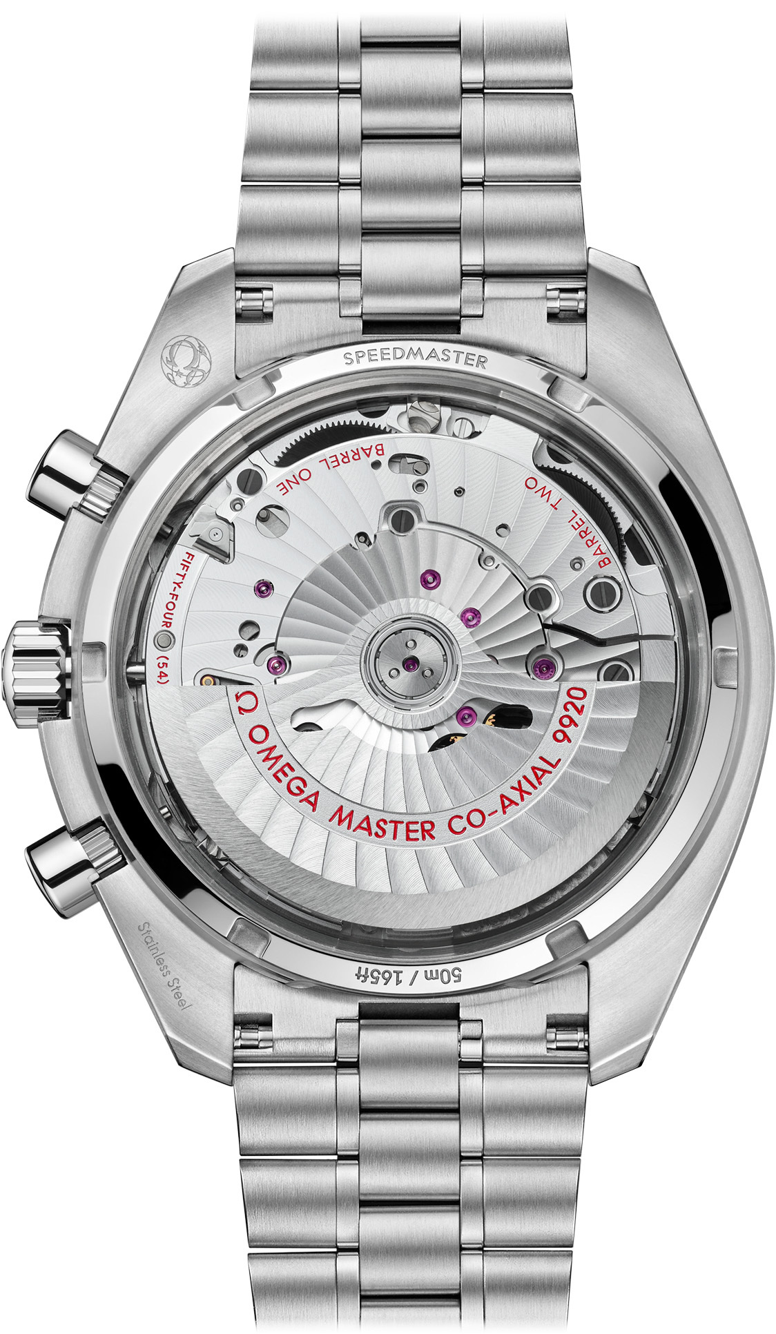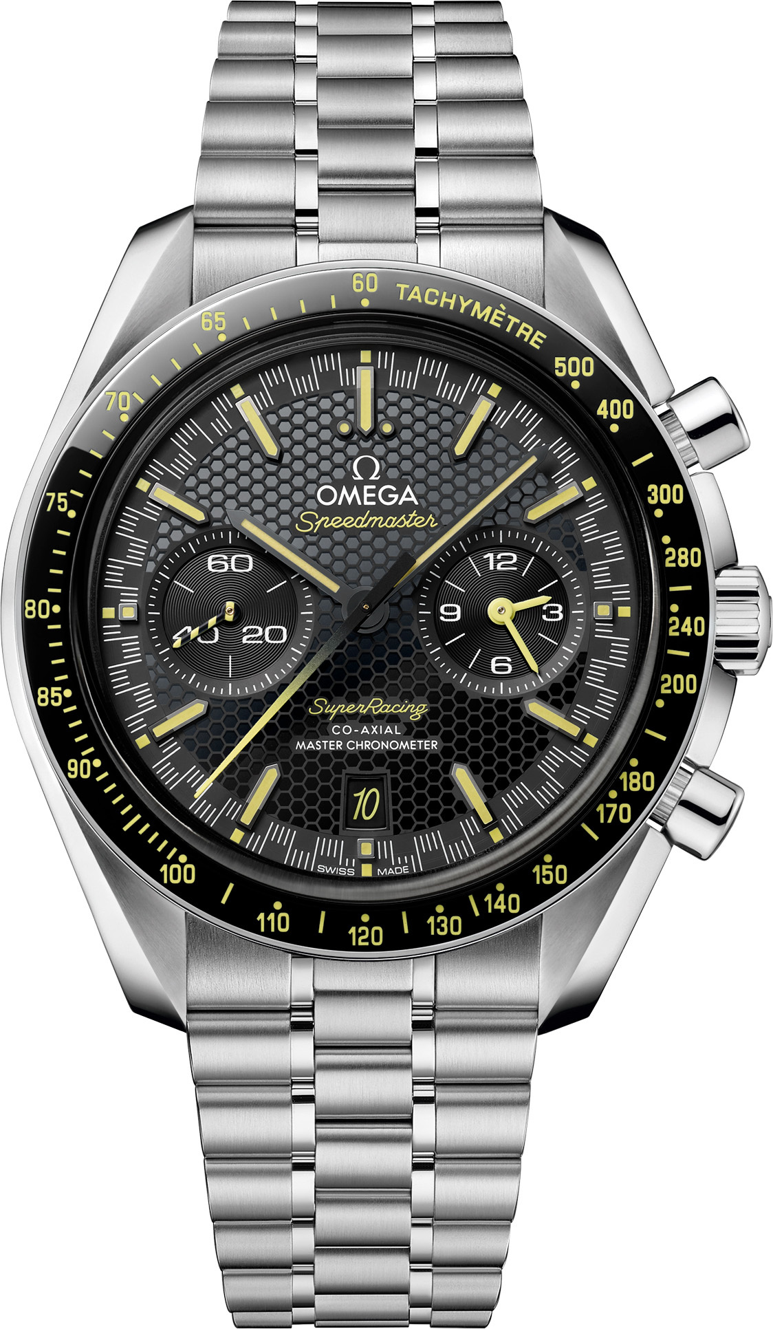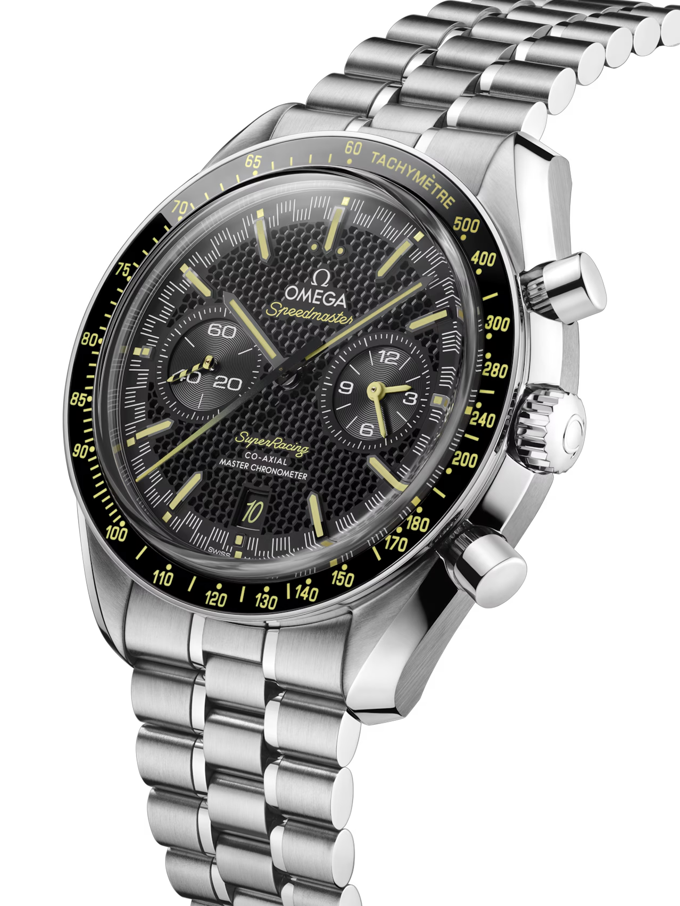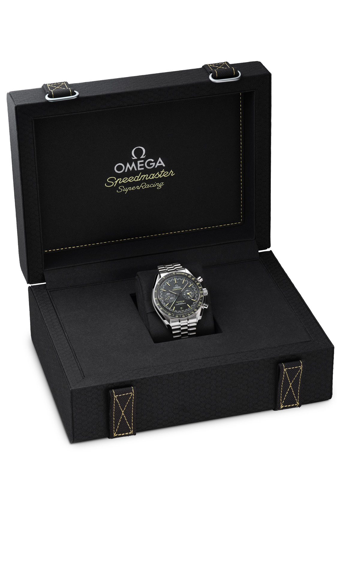 The new 44.25 mm stainless steel Speedmaster from OMEGA is the first watch to feature the revolutionary Spirate™ System. The black sandwich dial, featuring a honeycomb pattern, boasts a racing-inspired minute-track that gives the watch its name.