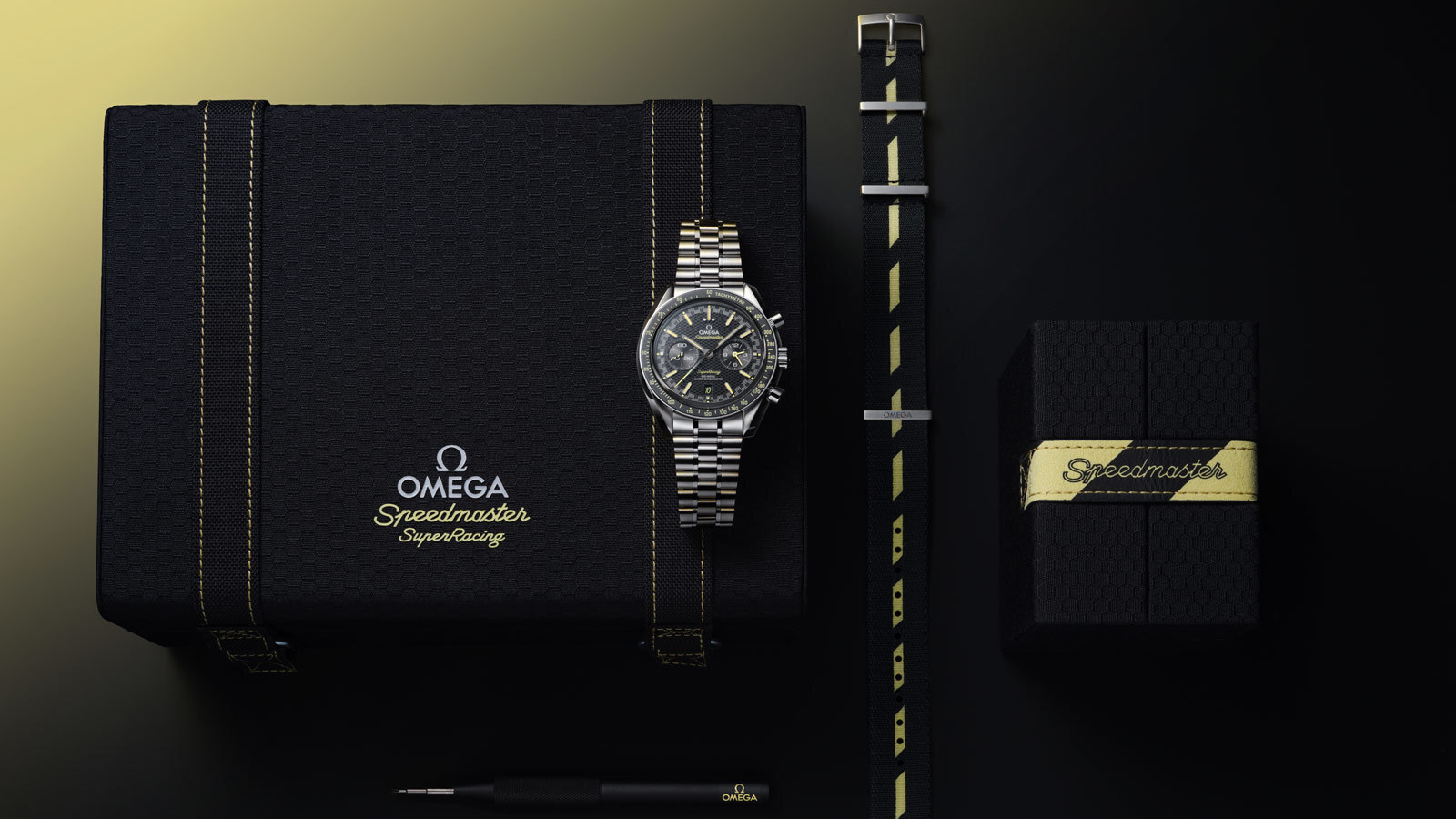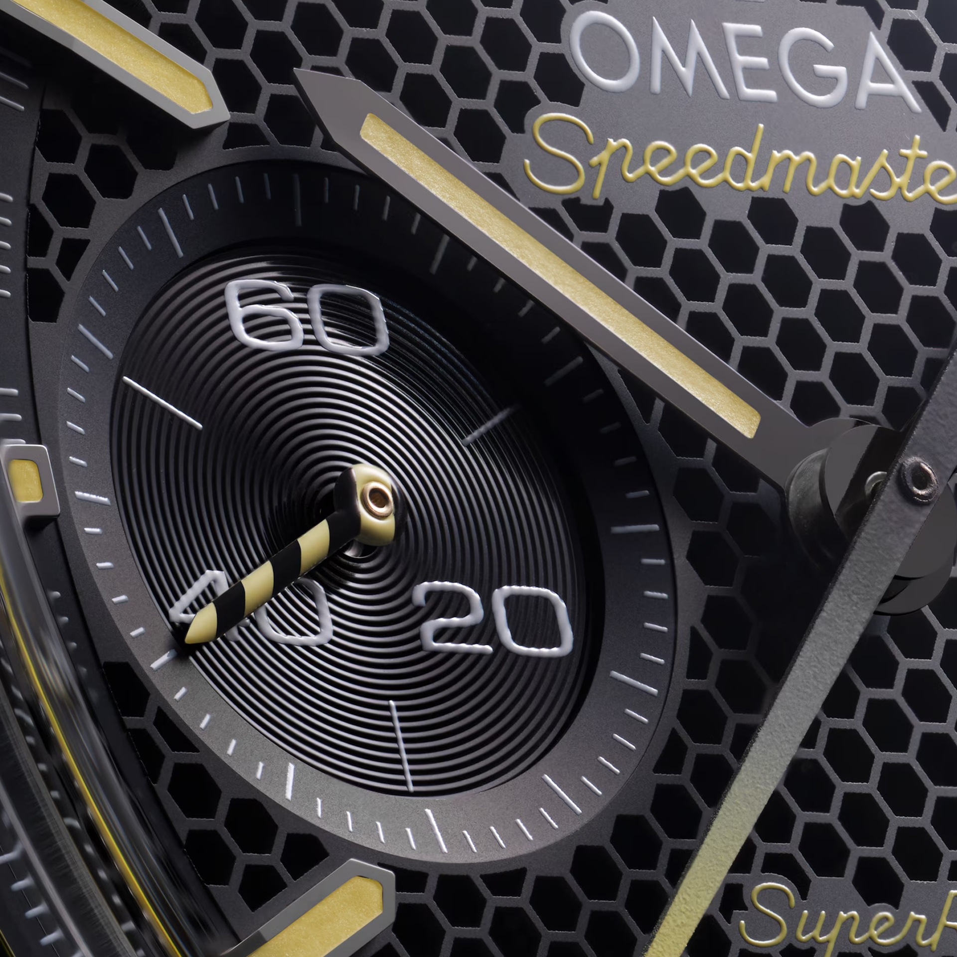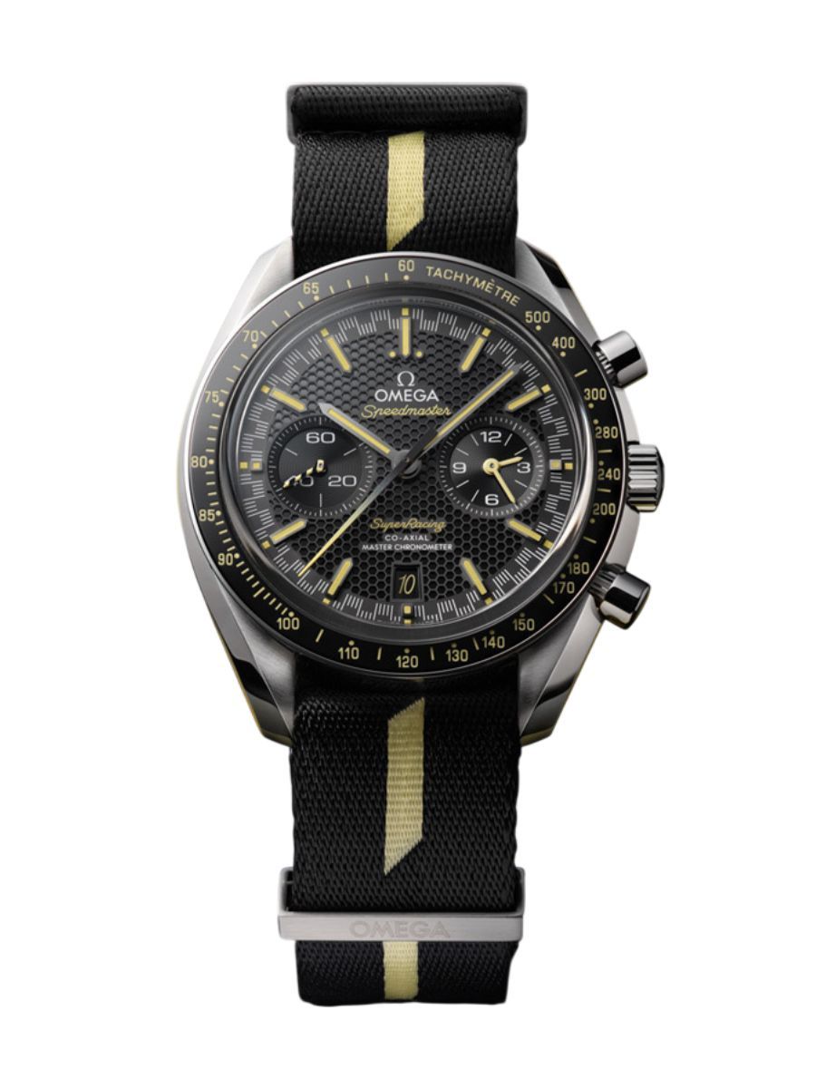 The watch is powered by OMEGA's Co-Axial Master Chronometer 9920, certified by METAS at the industry's highest standard. The watch comes in a honeycomb patterned Speedmaster box in black with yellow stitching, and includes a recycled nylon NATO strap with black and yellow stripes.