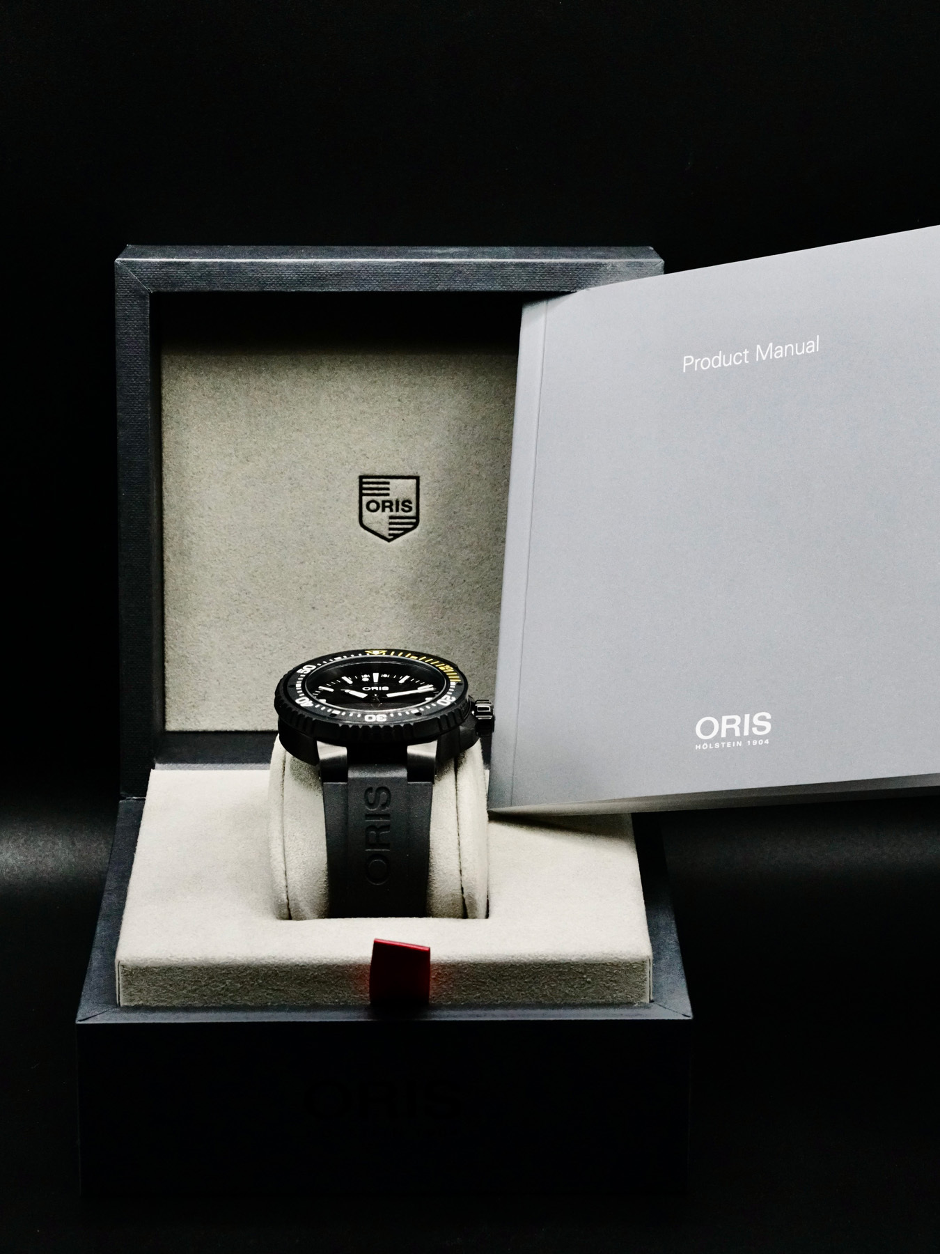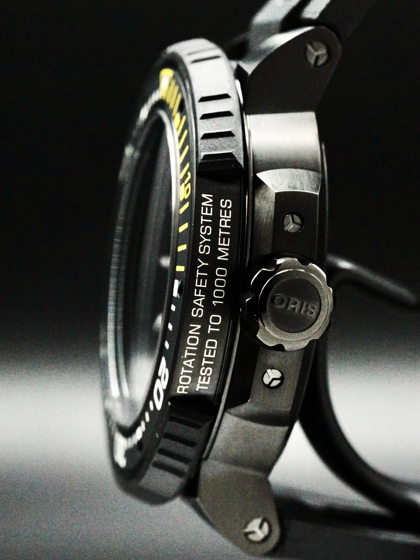 The Oris AquisPro Date features the in-house Calibre 400 automatic movement, and a lightweight titanium case on a 49.5mm case. With a yellow and white minutes scale engraved into the scratch-resistant ceramic bezel for high levels of legibility. Designed to serve professional divers, the AquisPro Date Cal 400 features Oris's patented Rotation Safety System to lock the uni-directional rotating bezel in place.