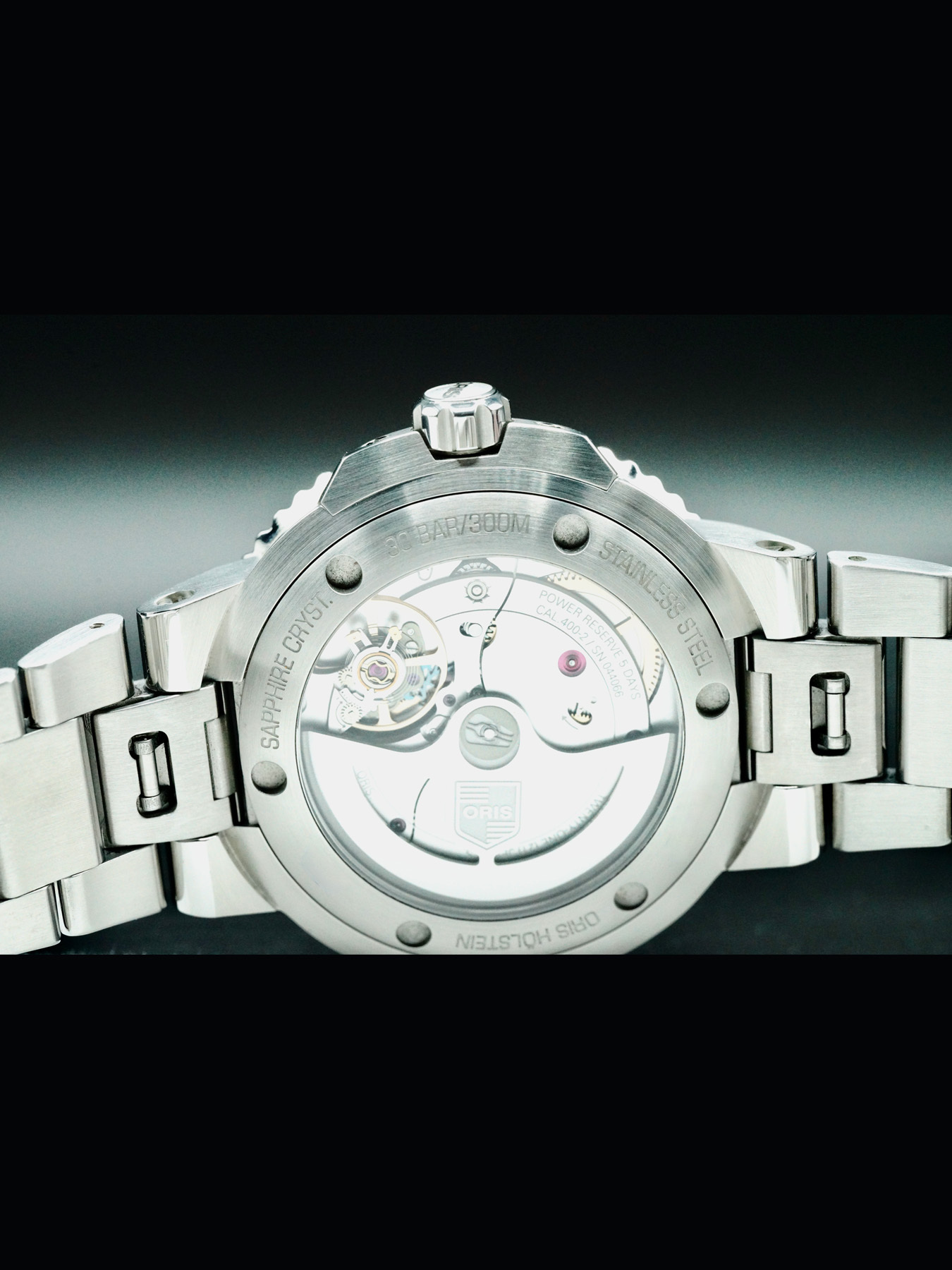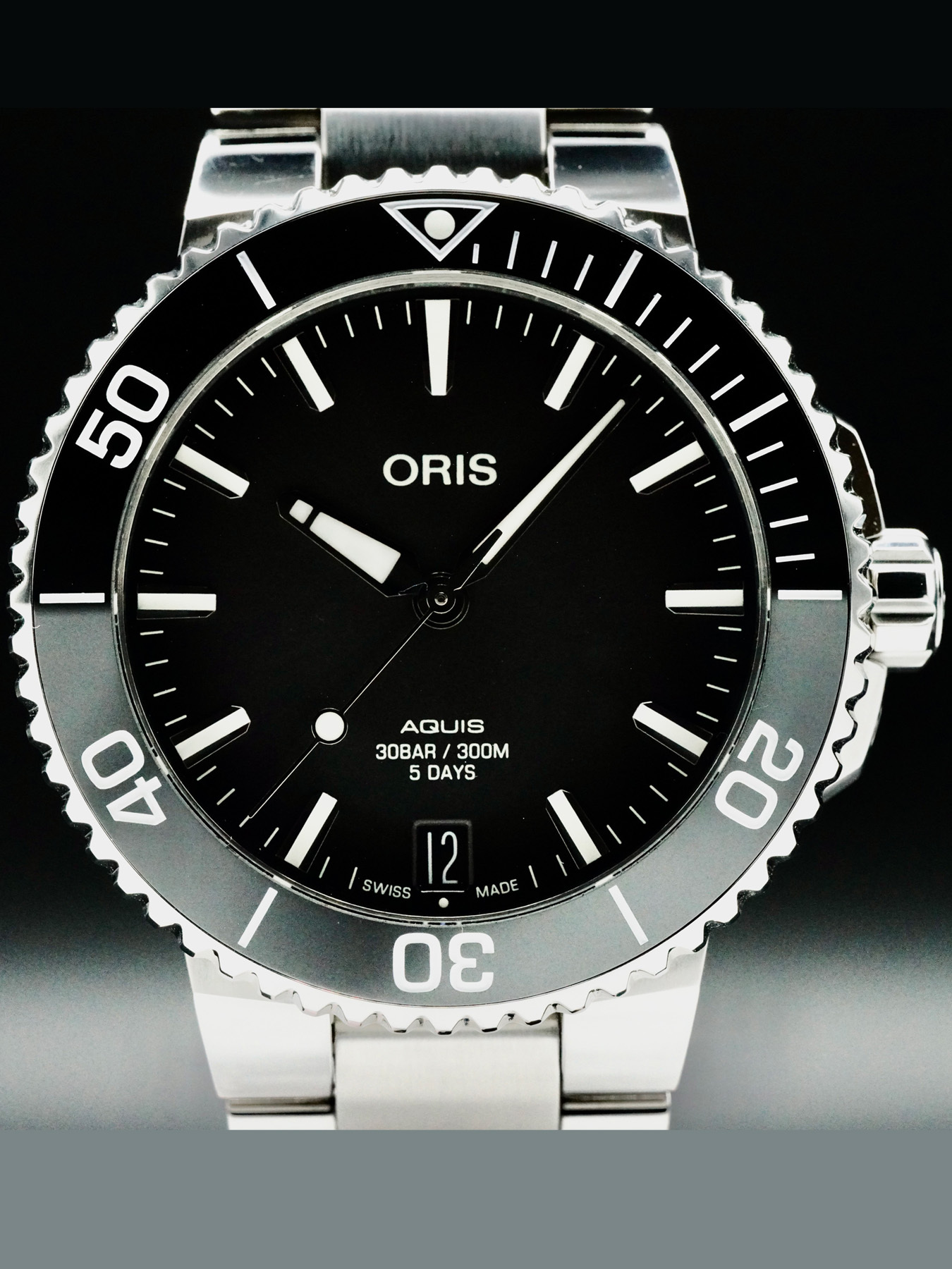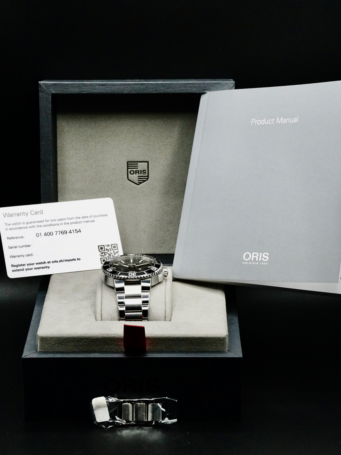 This Oris 01 400 7769 4154-07 8 22 09PEB Aquis Date Calibre 400 is in GREAT condition. This watch includes original box, instruction booklet and warranty card. Extra stainless steel bracelet links. This watch has been fully authenticated and certified by Exquisite Timepieces.
