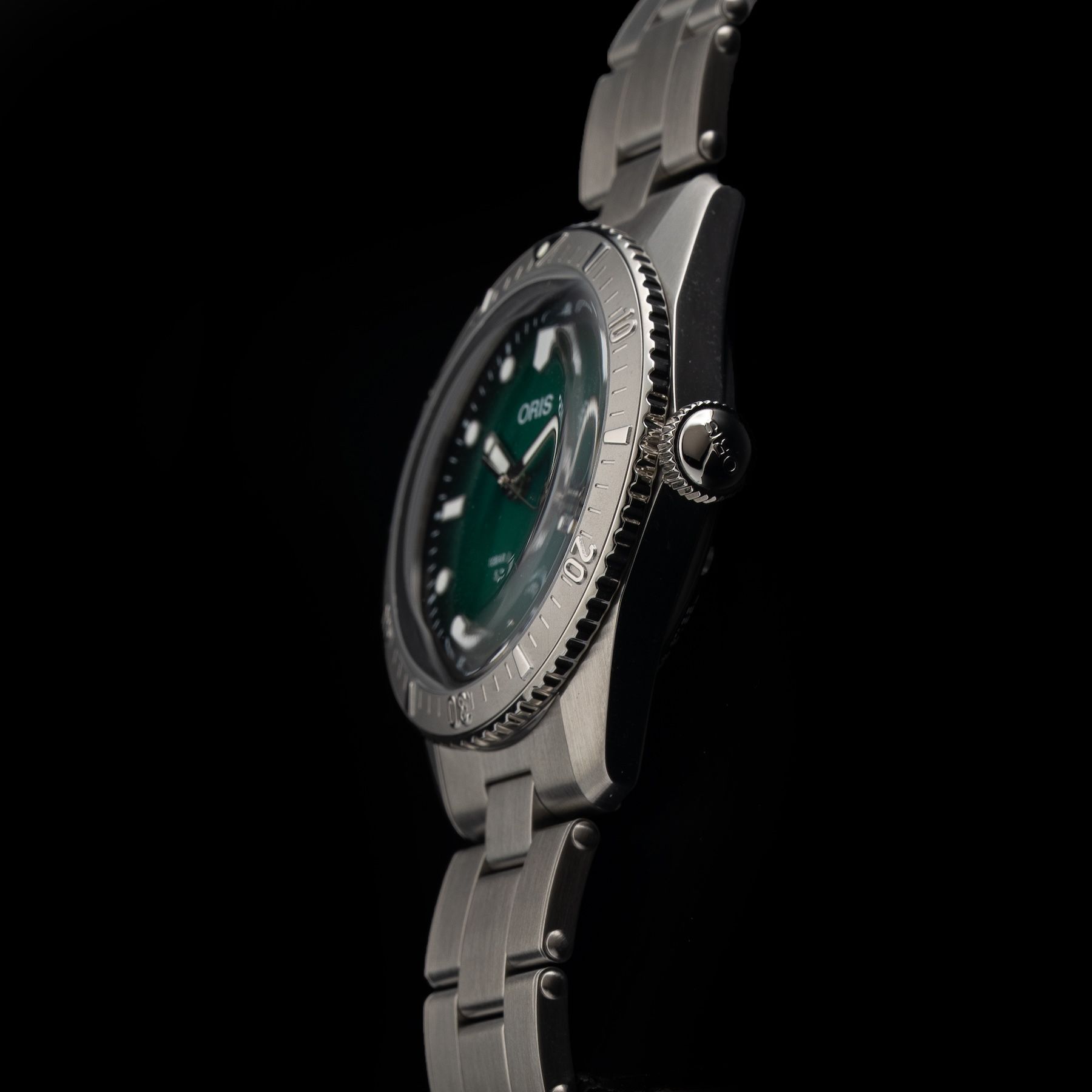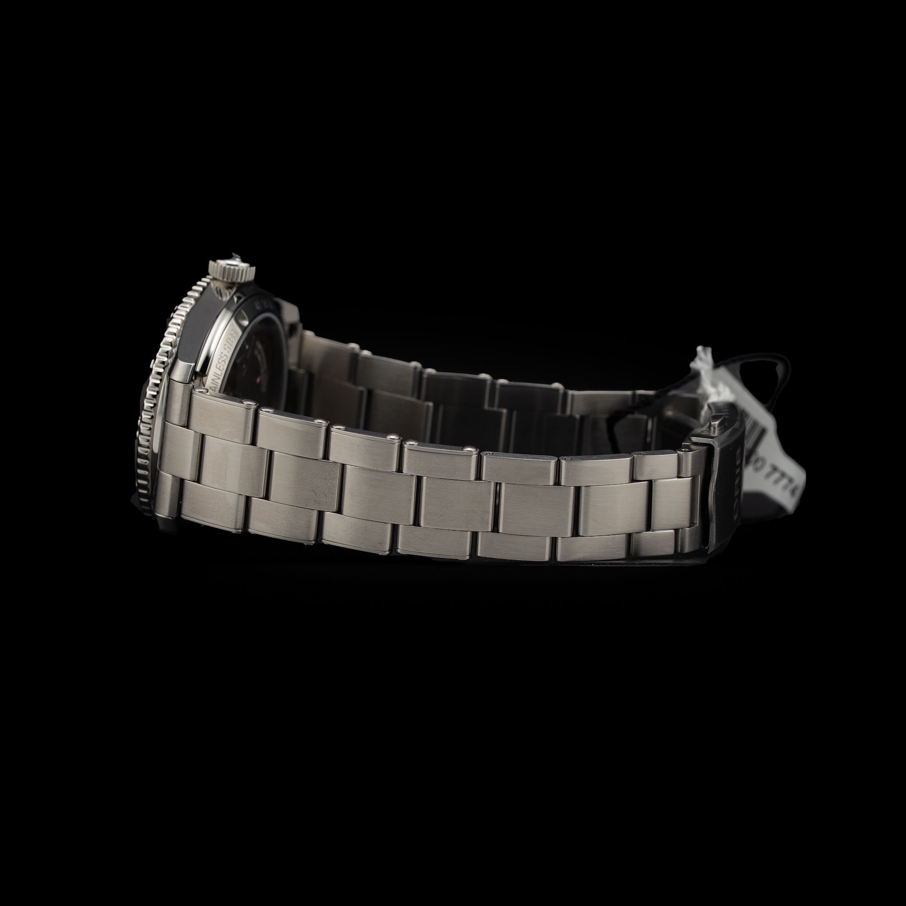 Multi-piece stainless steel case and uni- directional rotating bezel with minutes scale in relief