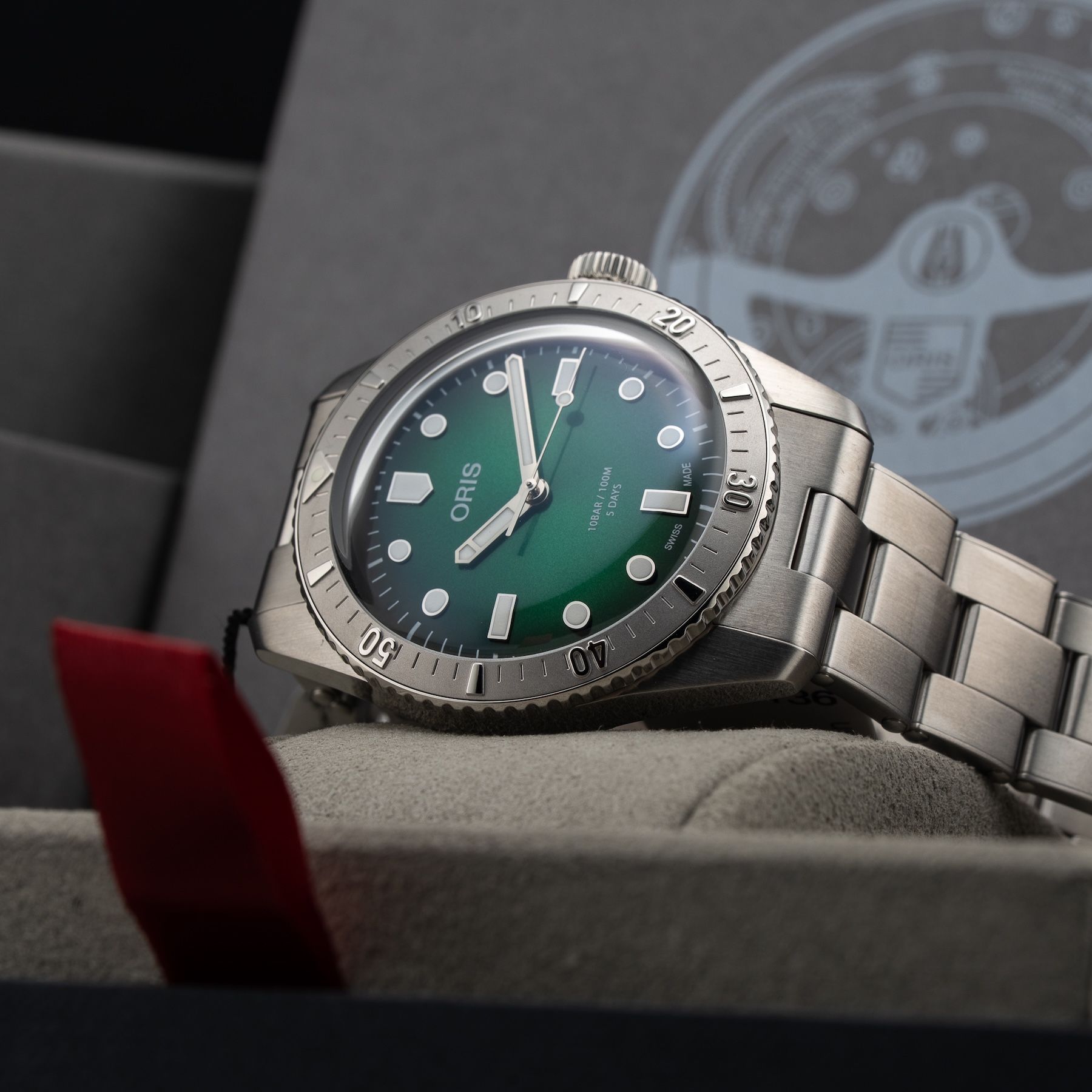 - This timepiece features a 30mm steel case paired with a high quality steel bracelet. It showcases a distinctive gree dial and is powered by a precise automatic winding movement. The watch is designed with a water resistance of up to 100m.