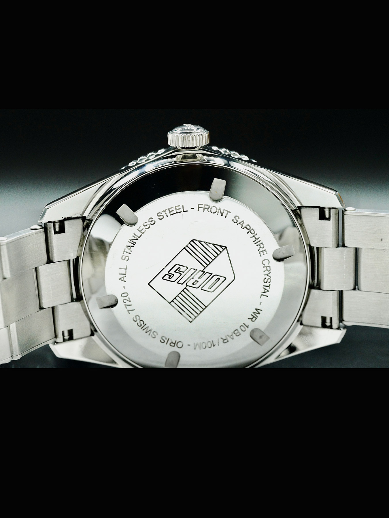 Automatic winding movement powered by Oris Caliber 733 with a power reserve of approximately 38 hours. Water resistance up to 100 meters.