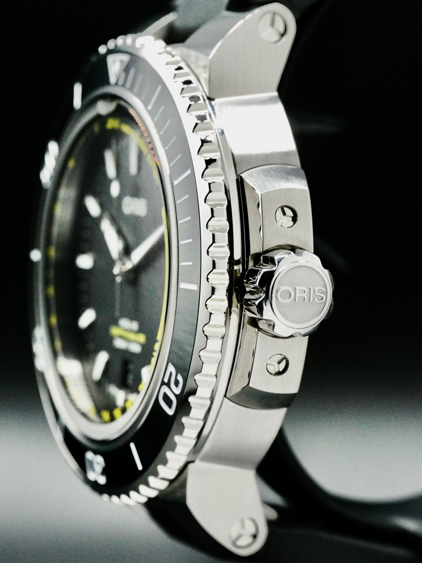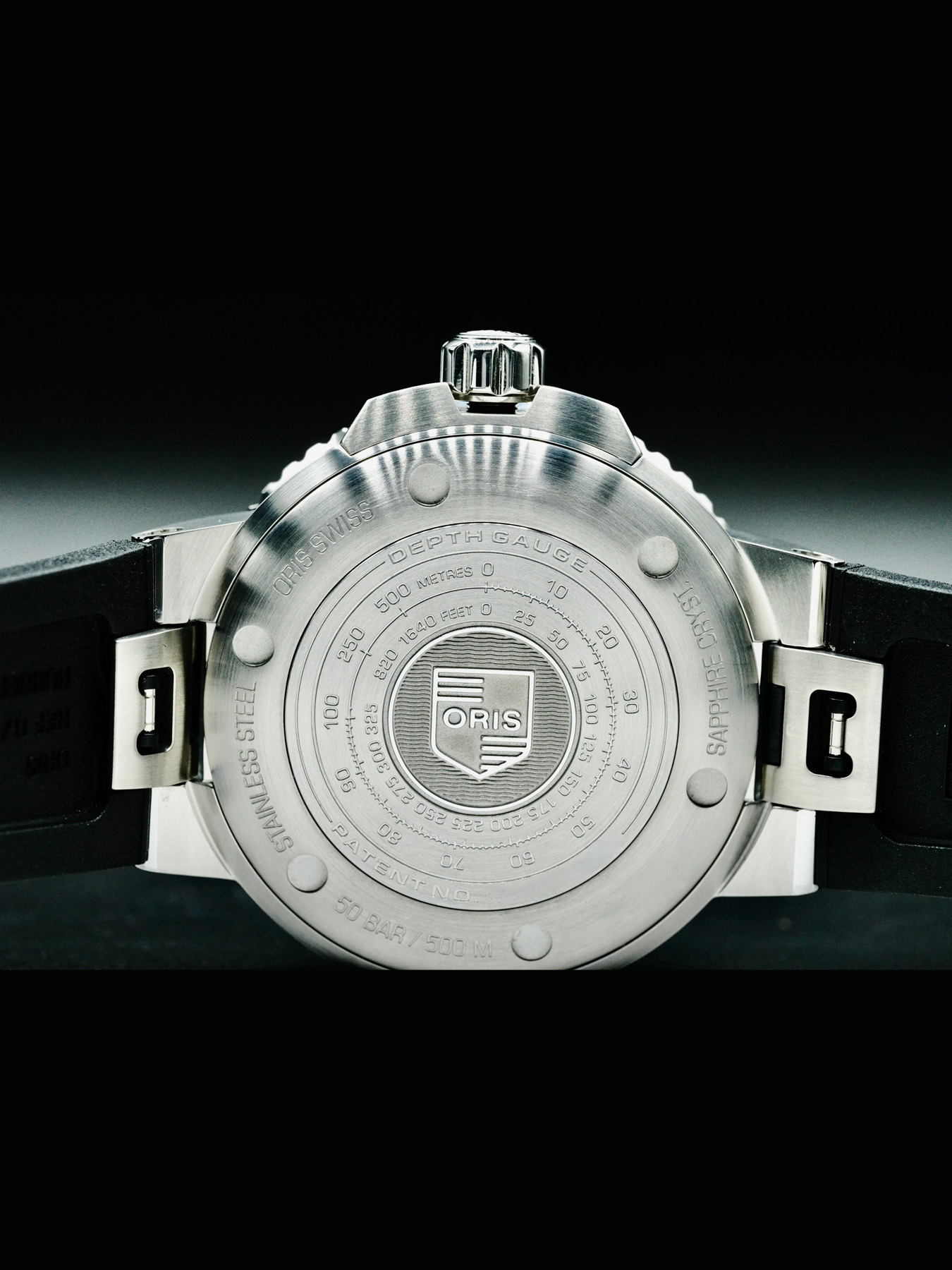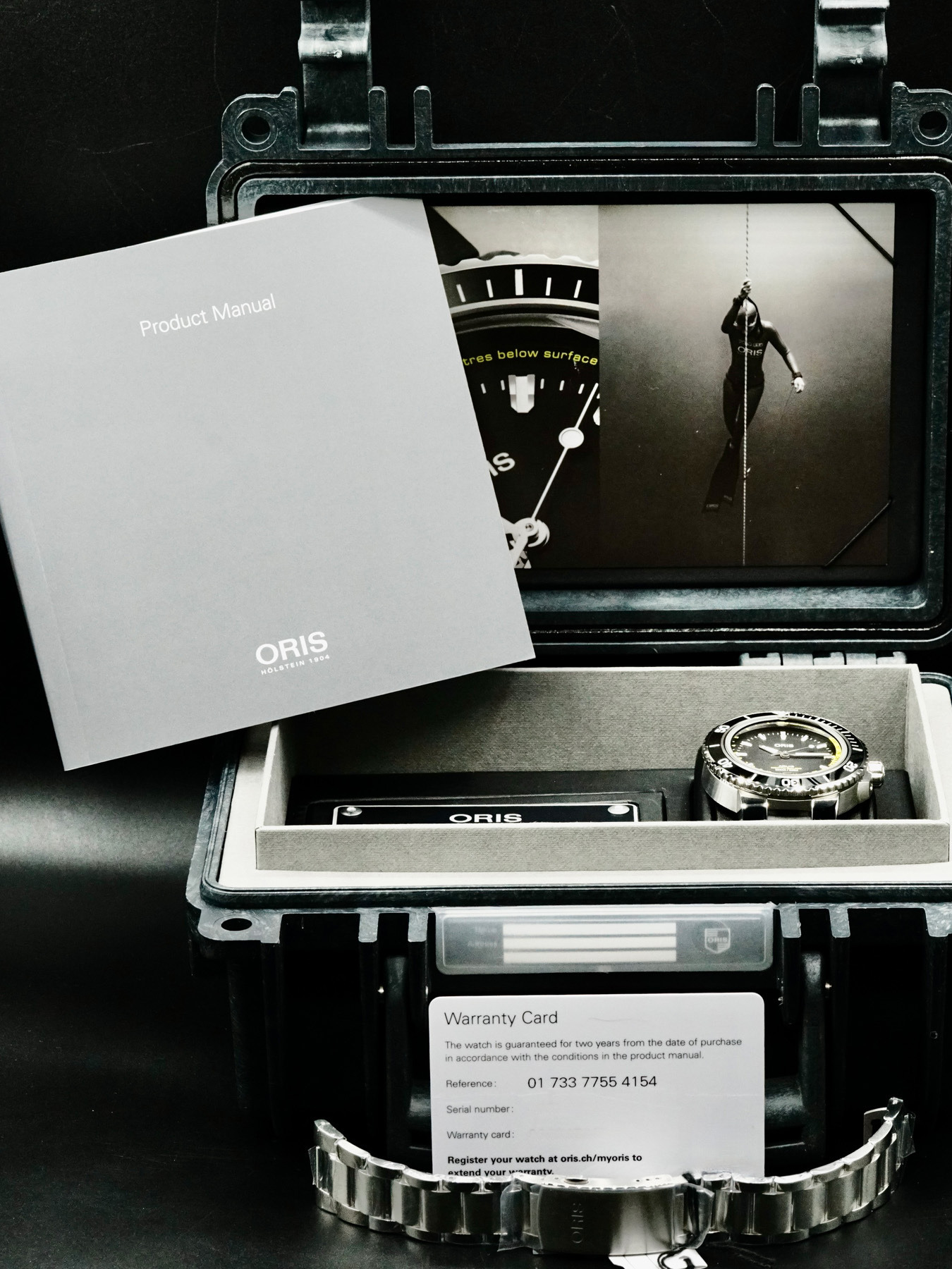 This Oris Aquis Depth Gauge 01 733 7755 4154-Set is in EXCELLENT condition. This watch includes its original box, product manual, and warranty card. No date on warranty card. Extra stainless steel bracelet.