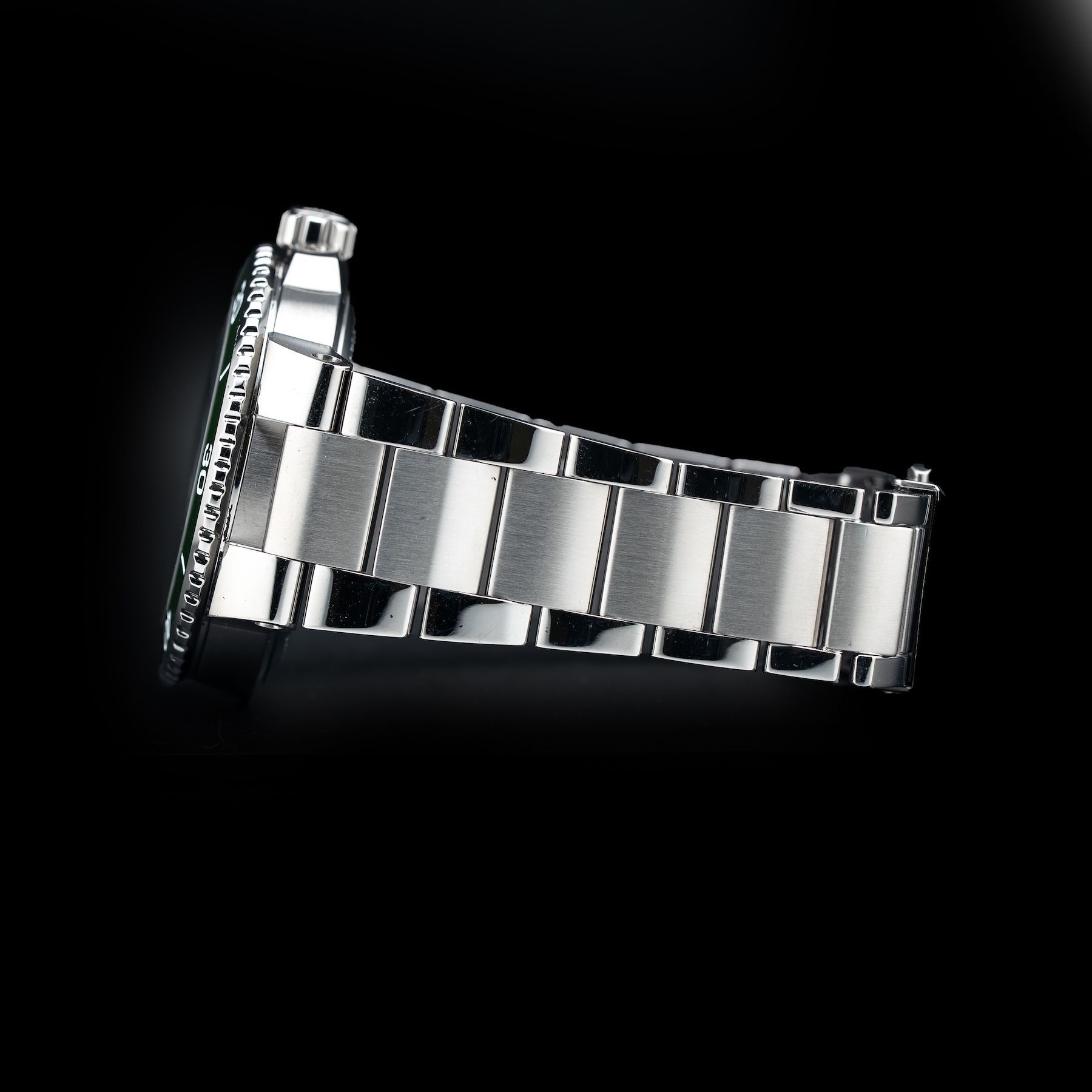 This watch features a 43mm stainless steel case on stainless steel bracelet. This watch also sports a green dial. Powered by a mechanical automatic movement. Water resistance up to 300 meters.