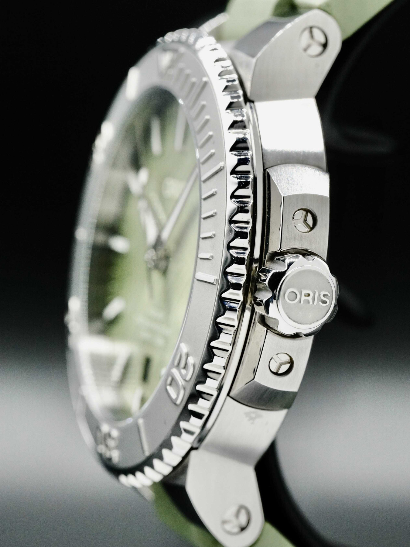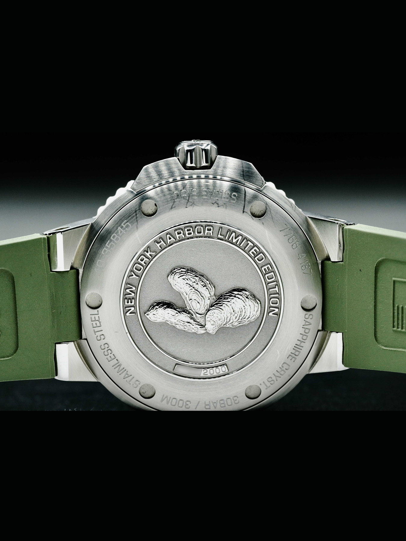 This Oris Aquis New York Harbor Limited Edition features a 41mm Stainless Steel case with solid caseback on rubber strap. This watch also sports a green dial with luminous hands and indexes. Limited Edition of 2000 Pieces