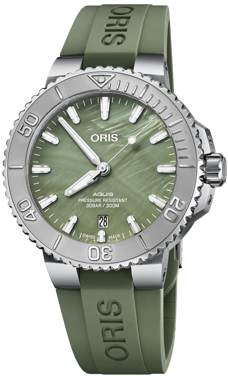 The watch has a green mother-of-pearl dial and comes with a rubber strap, bracelet and strap change tool.