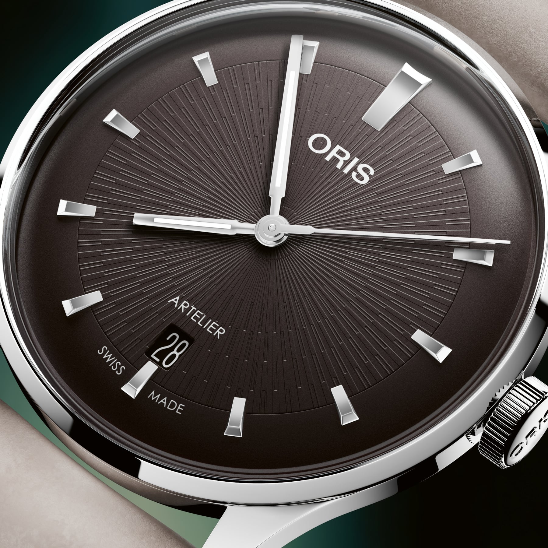 Oris is delighted to announce the revival of the Artelier line of urban dress watches. The new, fully redesigned collection includes this Artelier Date 38.00 mm version. It bares all the hallmarks of the new line: a taut, modern case; a simple, uncluttered dial design; and the option of a utilitarian new bracele t design. This contemporary, intentional expression of a classic and much - loved Oris design is a statement, designed for and by the next generation of Swiss Made mechanical watch lovers. The lead designer on the project was 24 - year - old Lena Huwiler. Her vision was to imagine a striking but universal watch design that would be enjoyed by her generation, by anyone passionate about industrial design, ergonomics, aesthetics and the eternal value of high - quality Swiss Made mechanical watches. That vision is clea rly visible across the collection, never more so than in this entry - level model, a protean piece that delivers the blend of style and versatility today’s buyers are looking for. Oris only makes mechanical watches, and so this is powered by an automatic with Oris’s signature Red Rotor clearly visible through the watch’s transparent case back.