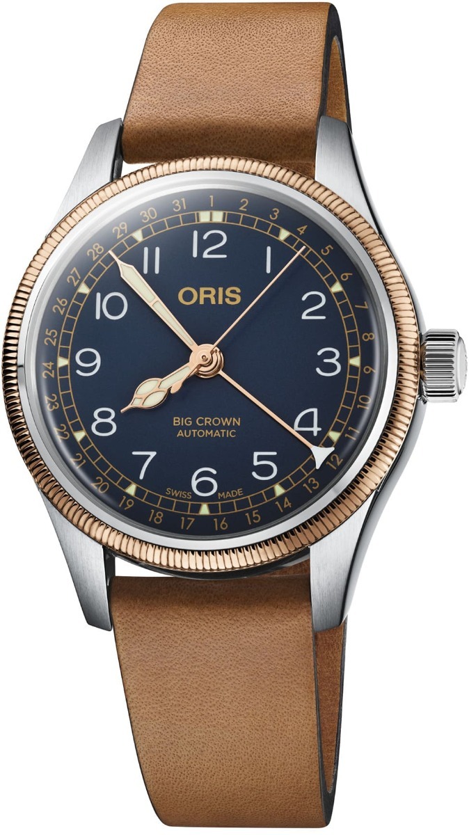 The Oris Big Crown Pointer Date is, without question, the most important watch in Oris’s rich history. First introduced in 1938 as a pilot’s watch, it has been a collection mainstay ever since, becoming Oris’s signature design. Its oversized crown was originally intended for gloved airmen but now serves a more aesthetic purpose, while the iconic pointer date function is now internationally recognised as a symbol of Oris’s mechanical inventiveness. The new 36mm bicolour version is more vintage in size and combines a stainless steel case and a bronze fluted bezel. These are paired strikingly with a deep blue dial.