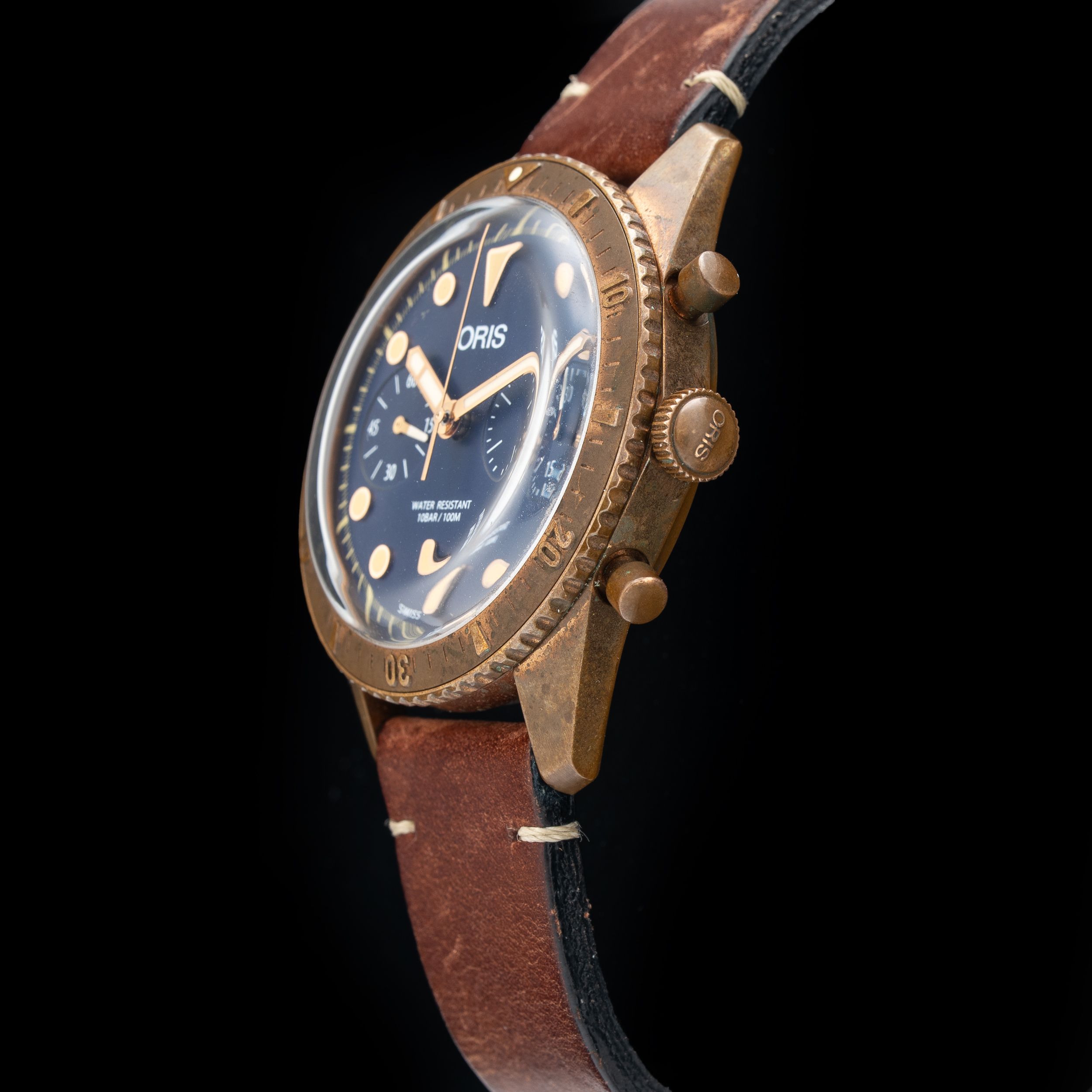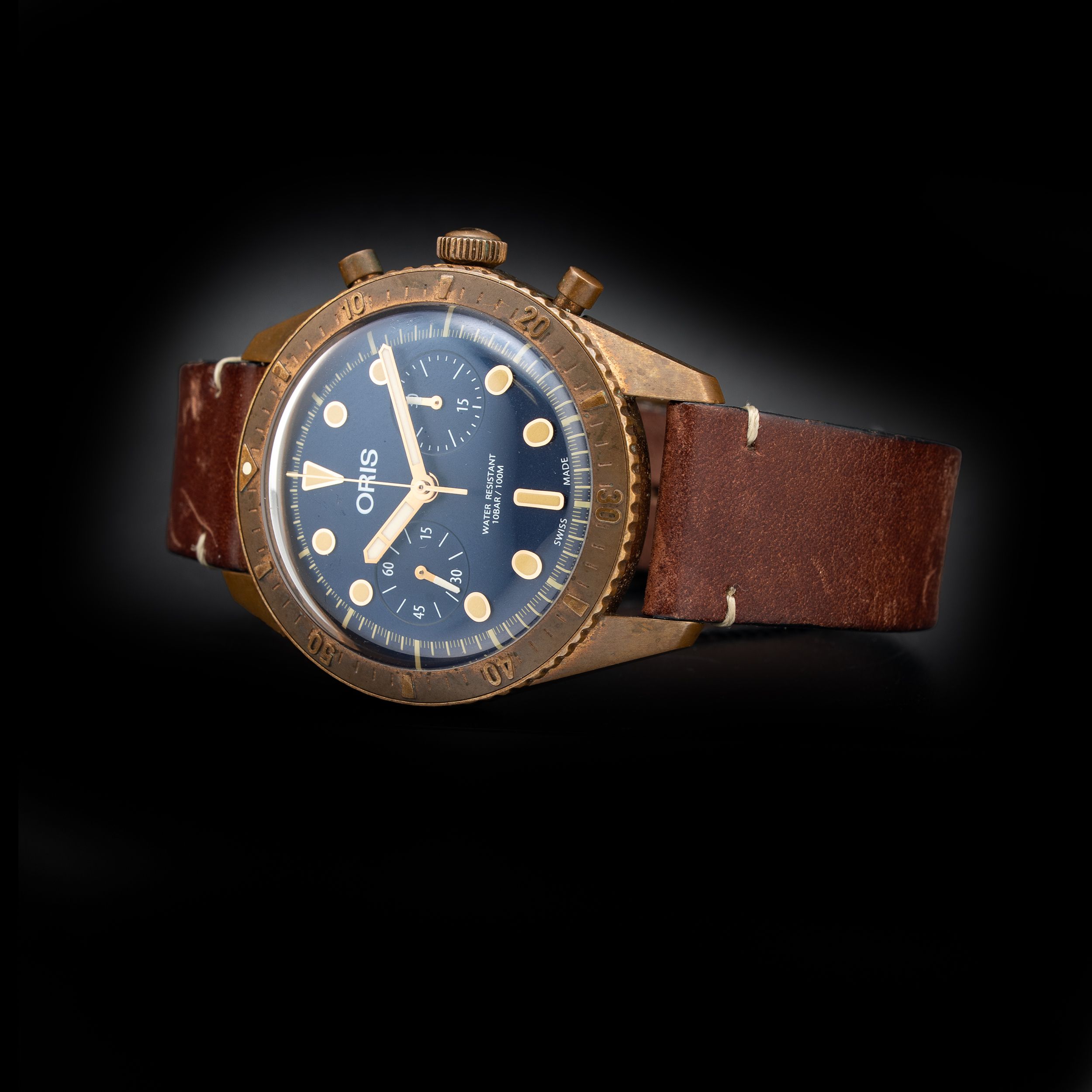 This watch features a 43mm bronze case on leather strap. This watch also sports a blue dial. Powered by an automatic winding movement. Water resistance up to 100 meters.