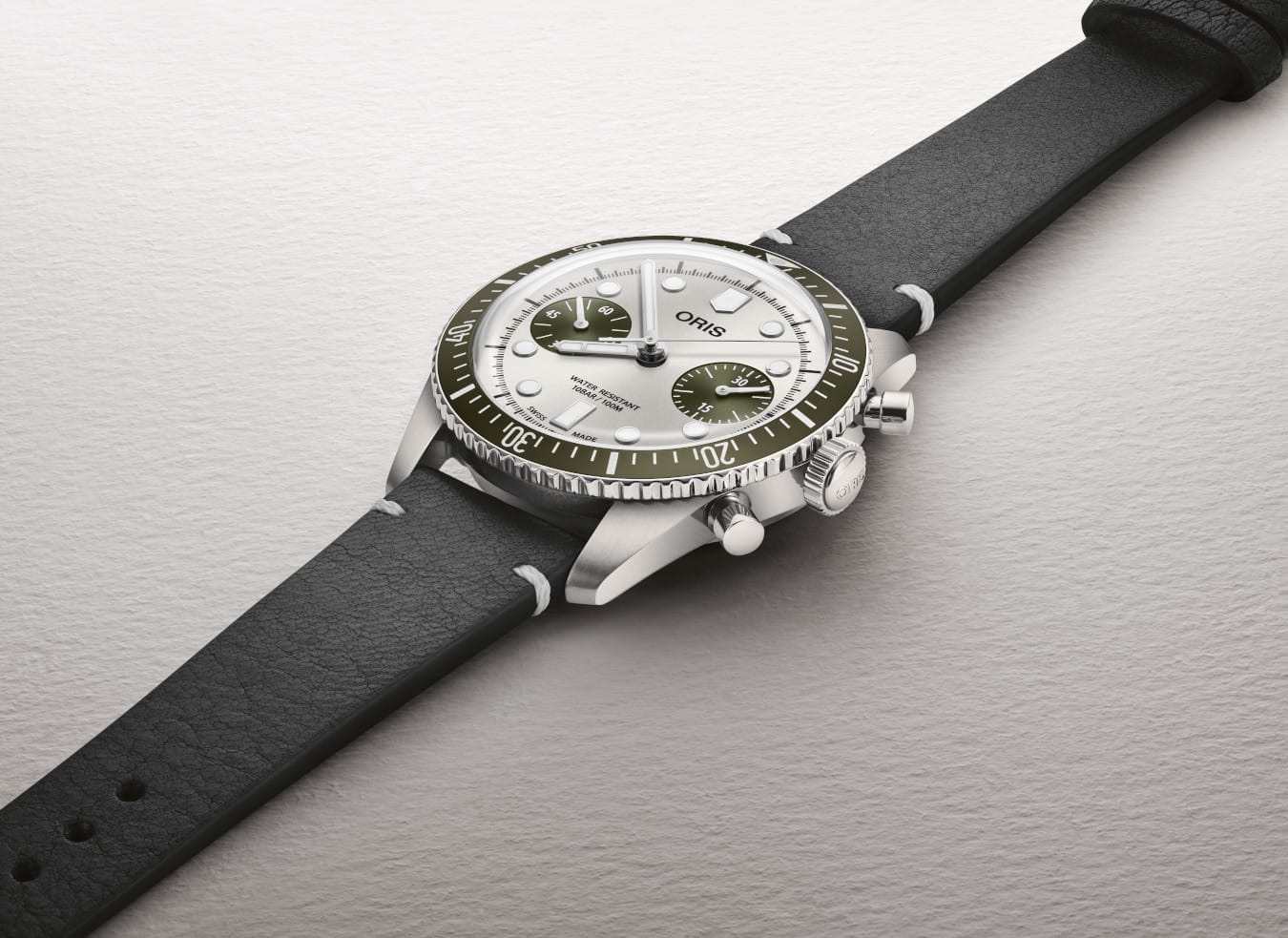 Ocean-green detailing and a silver sunray dial give our neo-vintage Divers Sixty-Five Chronograph a clean, sharp look. Backing retro touches such as those pump pushers is Oris Calibre 771, an automatic chronograph with a 62-hour power reserve.