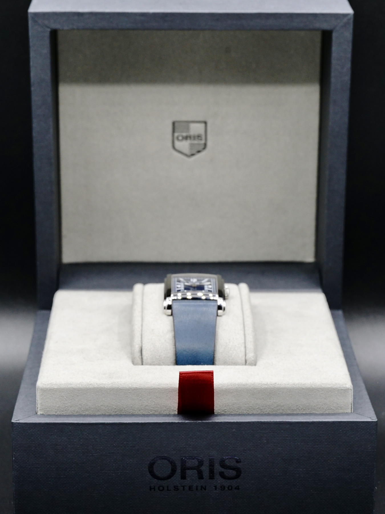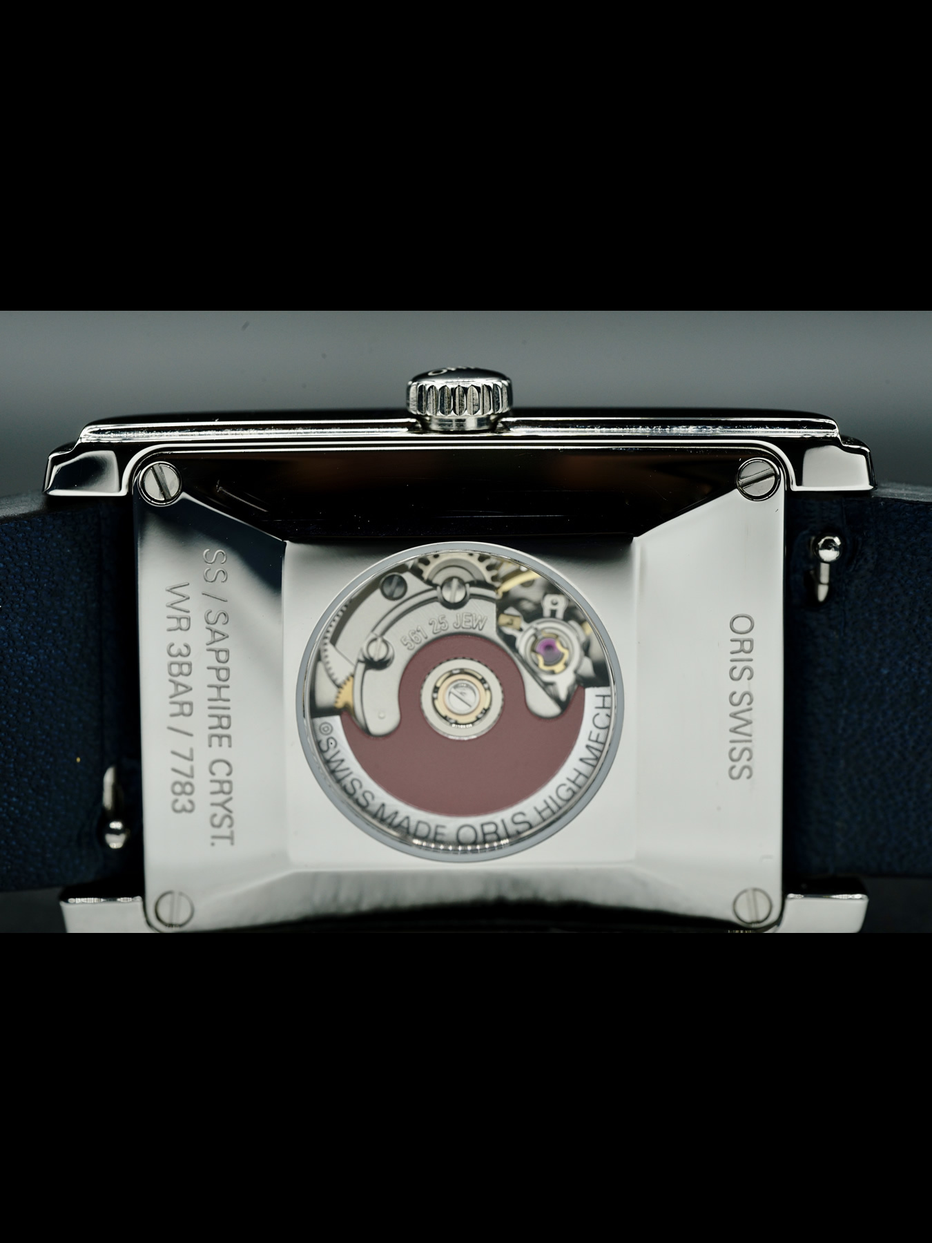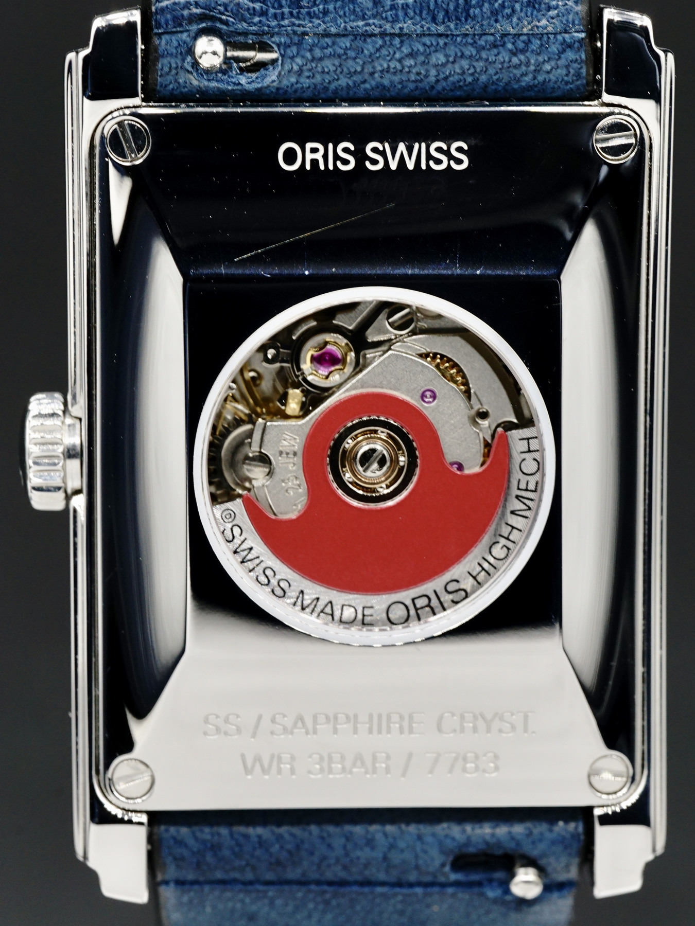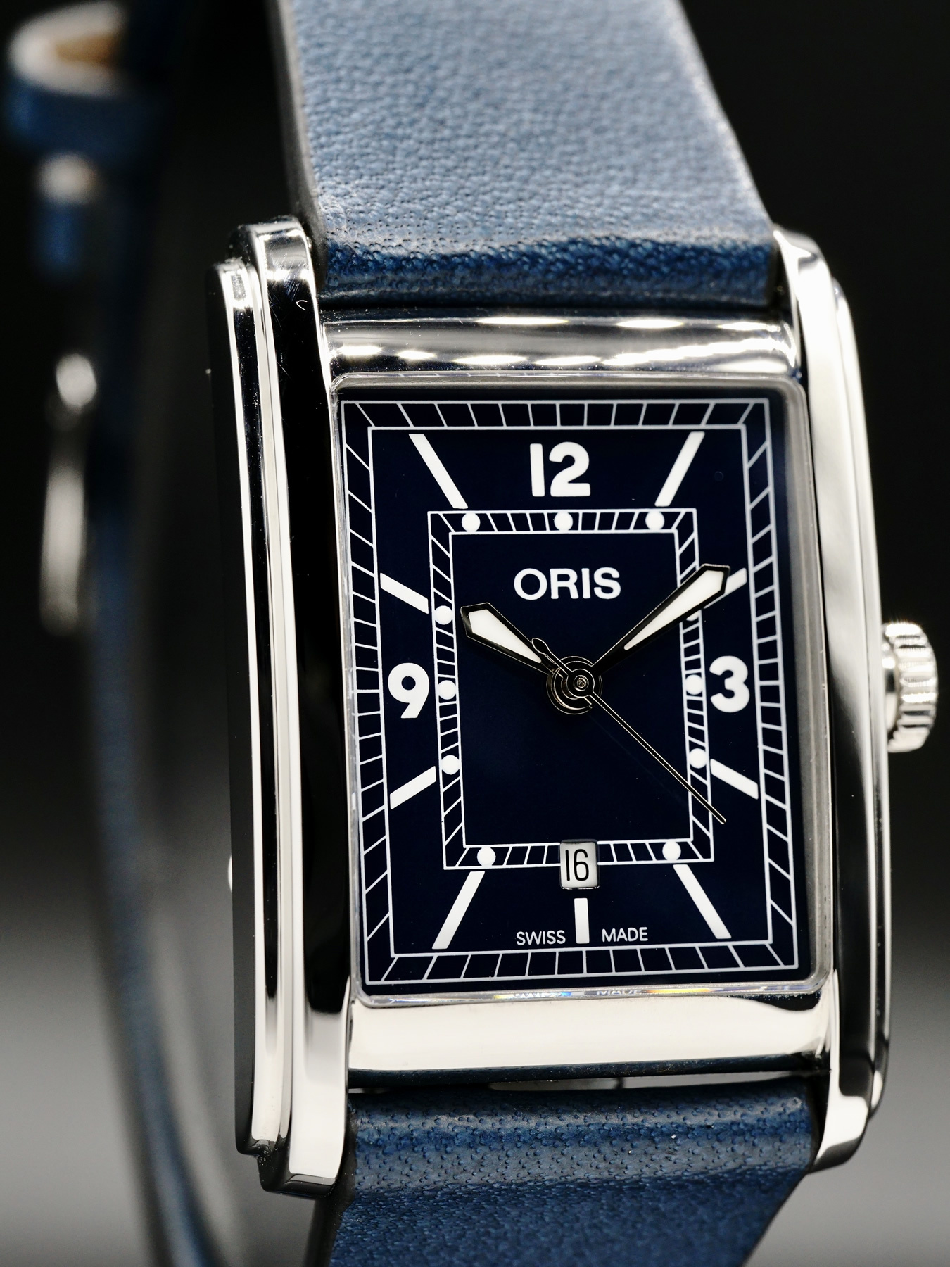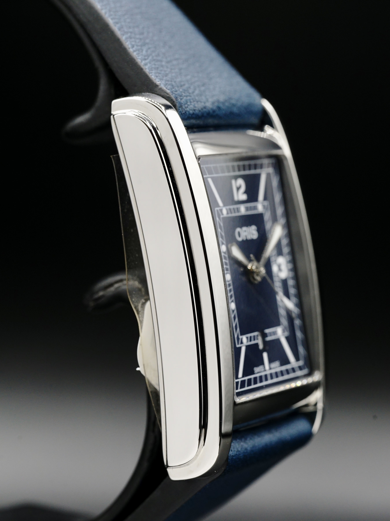 This Oris Rectangular features a 25.5 x 38mm stainless steel case with an exhibition case back on a blue leather strap. This watch sports a blue dial with superluminova hands covered by scratch resistant sapphire crystal.