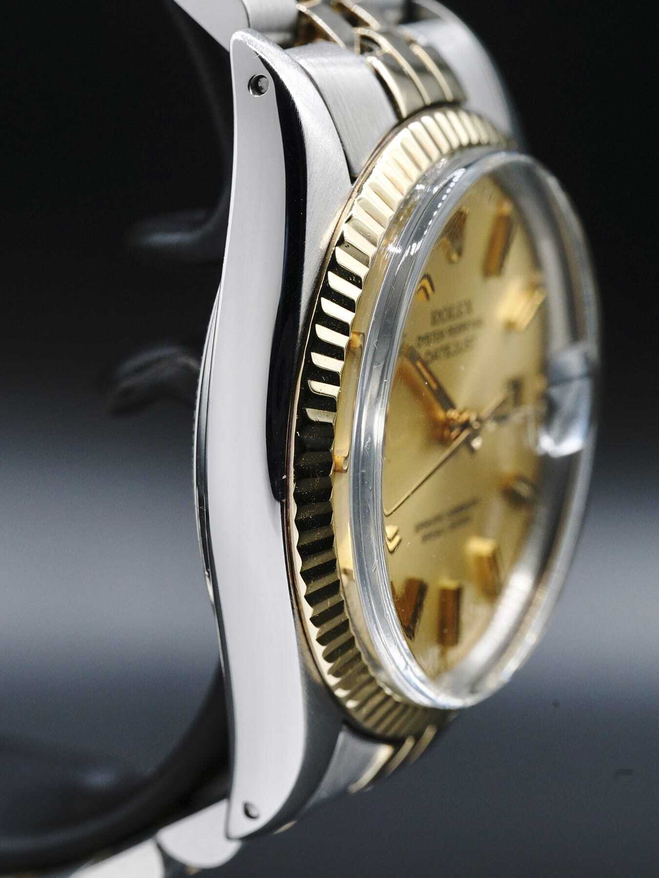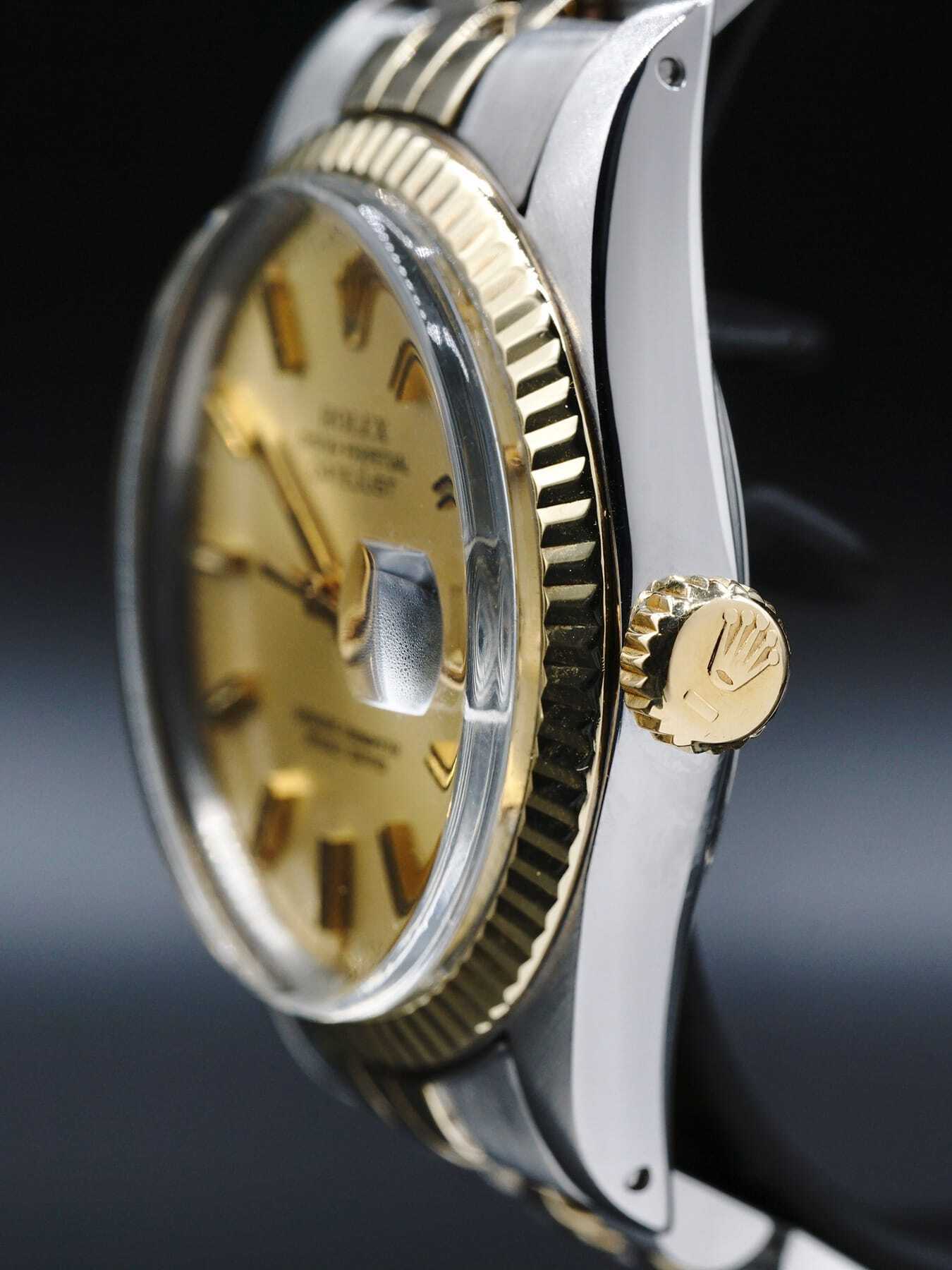 This Rolex Datejust features a 36mm stainless steel case with an 18k gold bezel on a stainless steel & 18k gold bracelet. This watch also showcases a champagne colored dial covered by anti-reflective acrylic crystal.