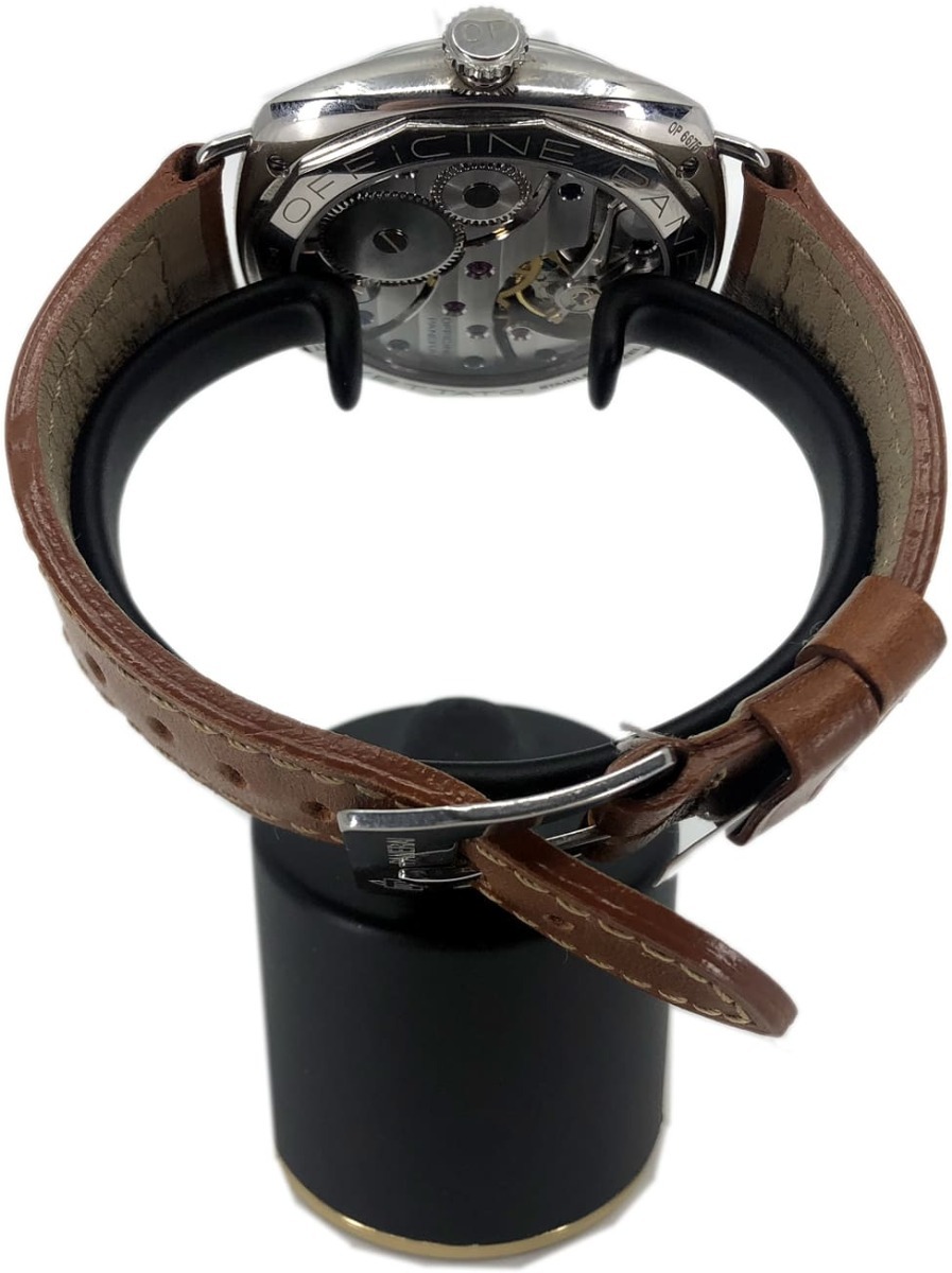- This timepiece features a 47mm steel case paired with a high quality leather strap. It showcases a distinctive black dial and is powered by a precise manual winding movement. The watch is designed with a water resistance of up to 30M.