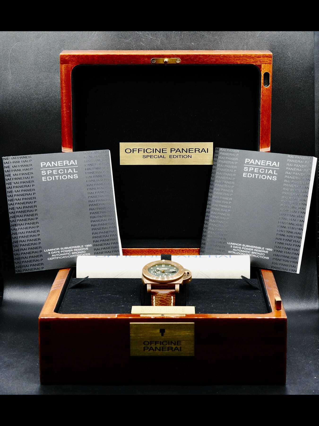 This Panerai 507 Luminor 1950 Submersible Bronze is in EXCELLENT condition. It has box and papers. Guarantee certificate dated for