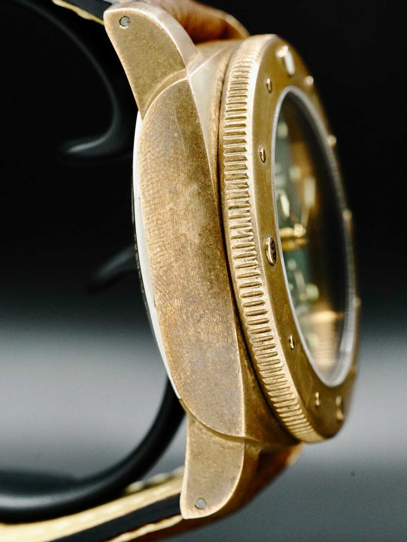 This watch features a 47mm bronze case on leather strap. This watch also sports a green dial.