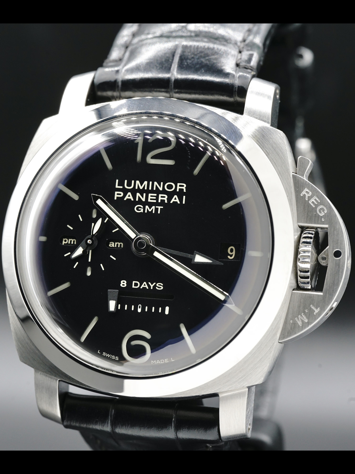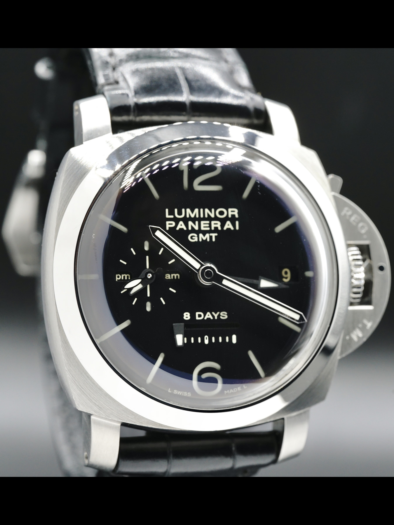 This Panerai Luminor 1950 8 Days GMT is in EXCELLENT condition. This watch includes its original box, instruction manual, and certificates booklet. Extra black rubber strap and a brown leather strap.