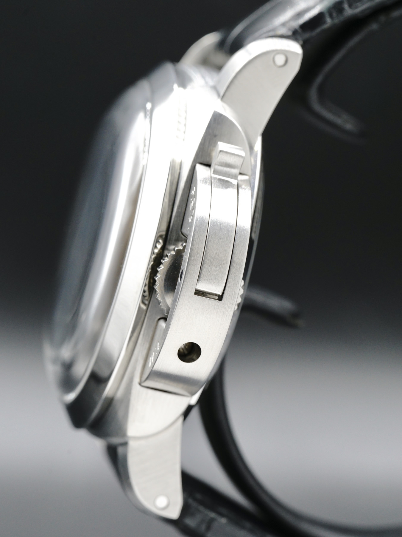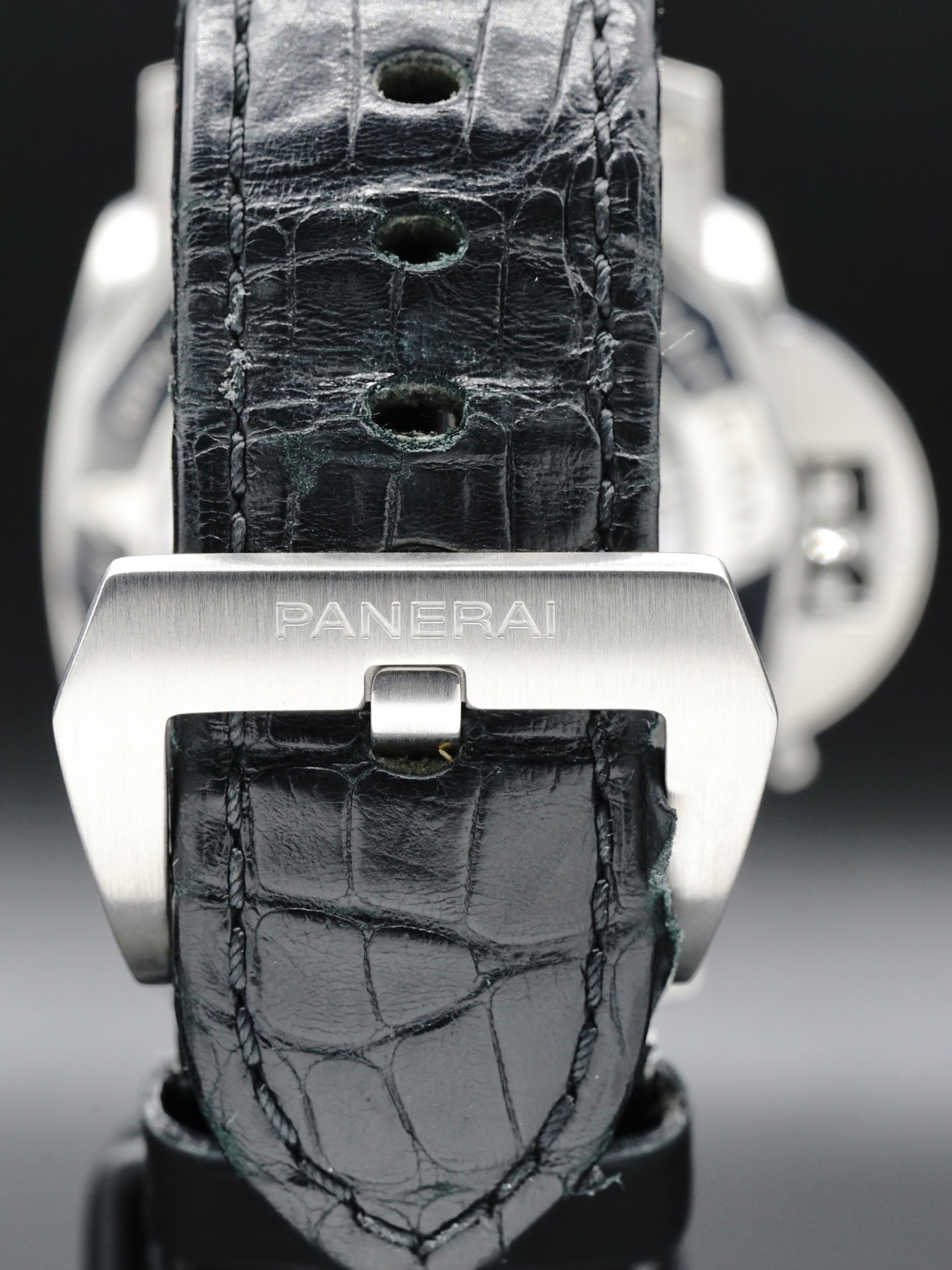 This Panerai Luminor 1950 8 Days GMT features a 44mm stainless steel case with a sapphire crystal skeleton case back. This watch also showcases a black dial with luminous hands covered by scratch-resistant sapphire crystal.