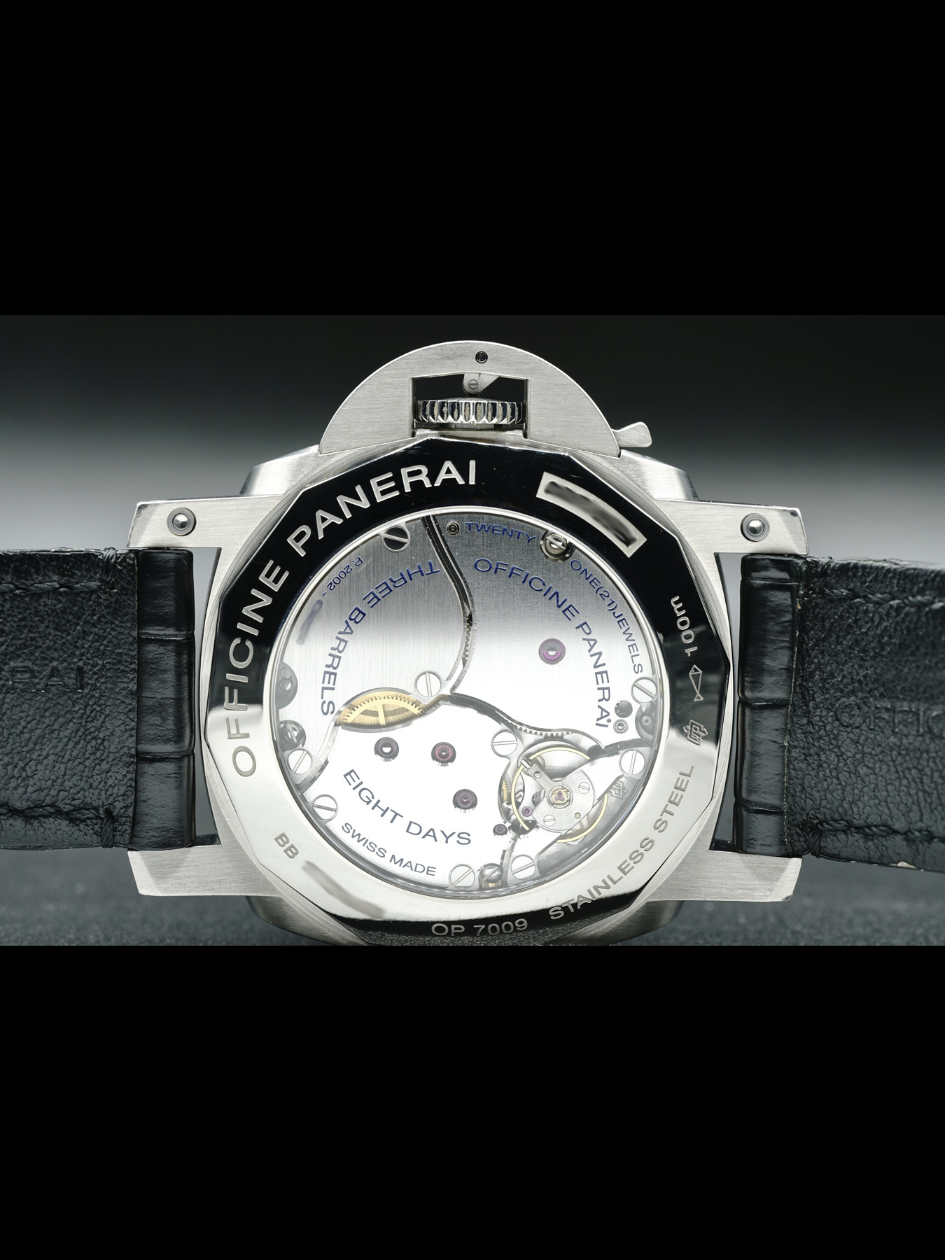Hand wind movement powered by Panerai Calibre P.2002 for a power reserve of 192 hours (8 days). Water resistance up to 100 meters.