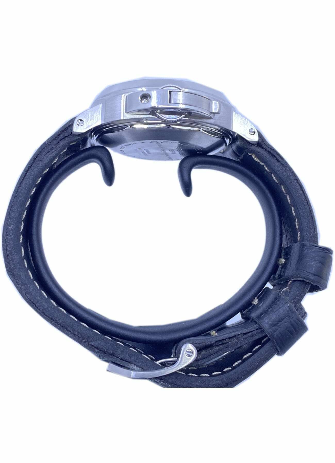 - This timepiece features a 40mm steel case paired with a high quality leather strap. It showcases a distinctive black dial and is powered by a precise automatic winding movement. The watch is designed with a water resistance of up to 300m.