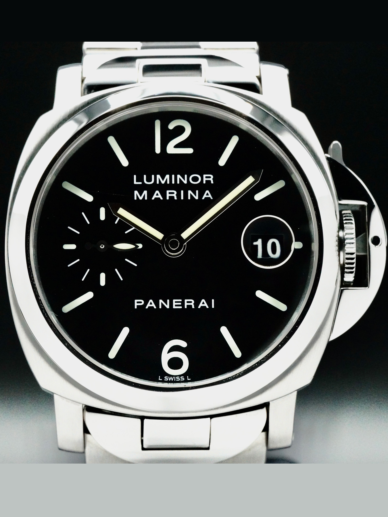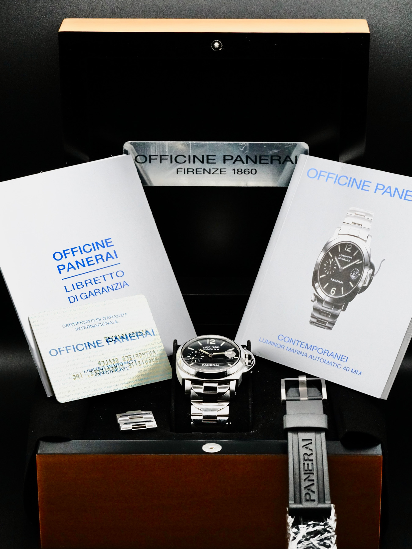 This Panerai PAM00050 Luminor Marina is in EXCELLENT condition. This watch includes its original box, instruction manual, and warranty card dated for 2002. Extra black rubber strap and stainless steel bracelet links. This watch has been fully authenticated and certified by Exquisite Timepieces.