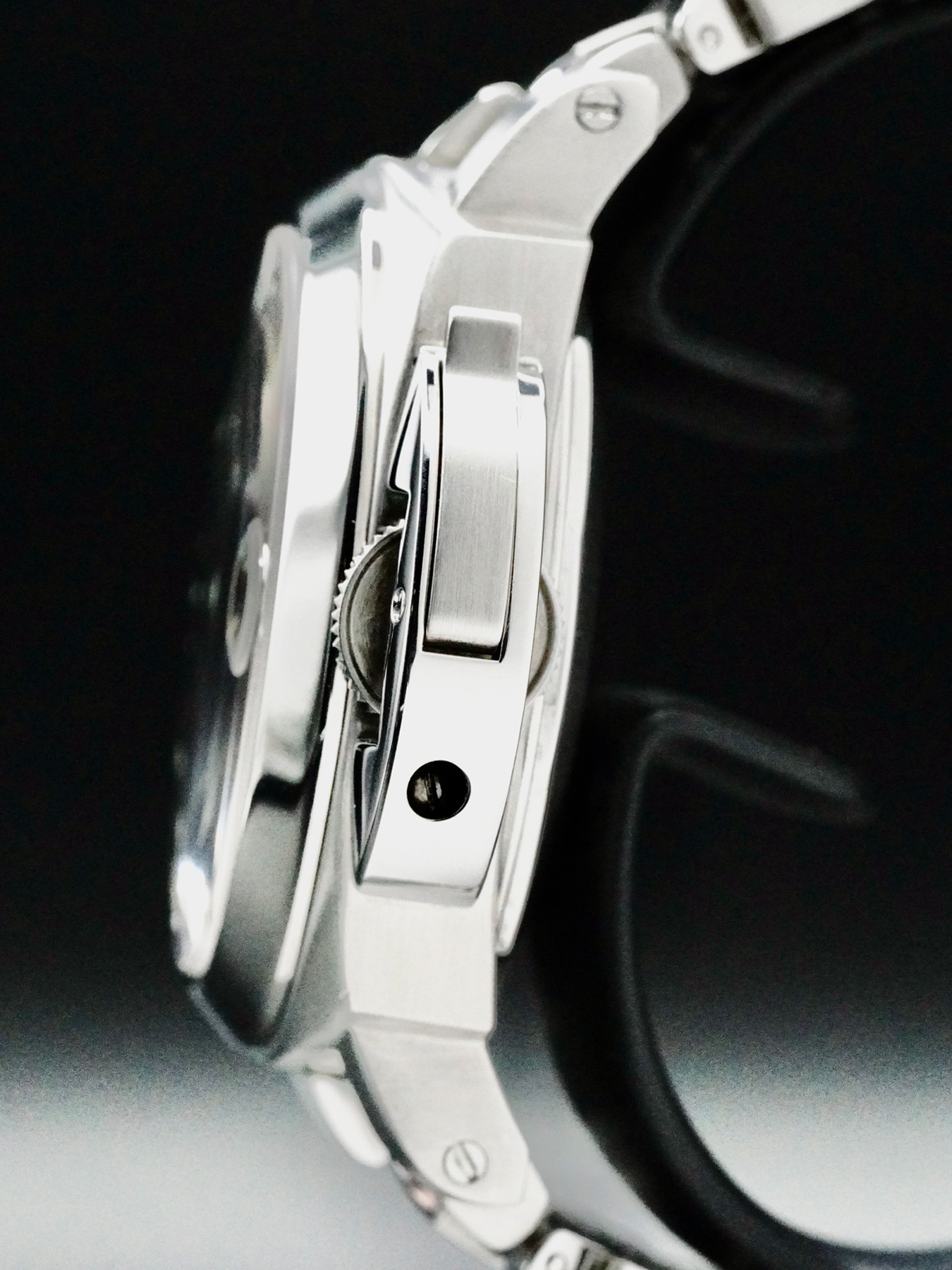 This watch features a 40 mm stainless steel case on a stainless steel bracelet. This watch also sports a black dial. Powered by a mechanical automatic movement. Water resistance up to 300 meters.
