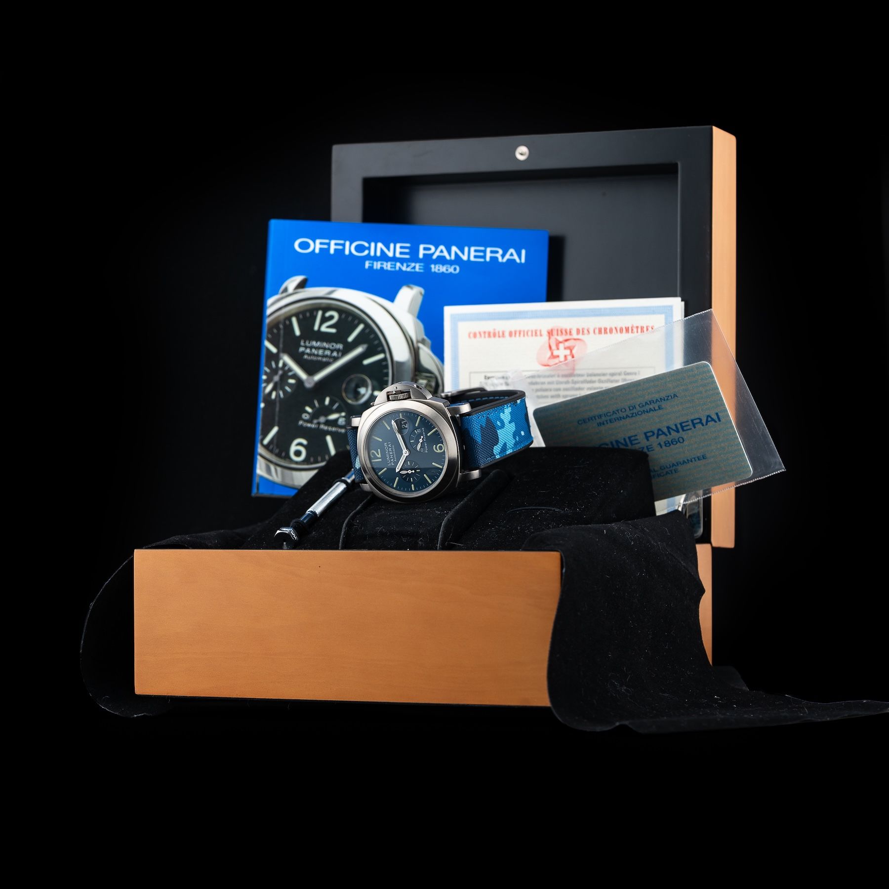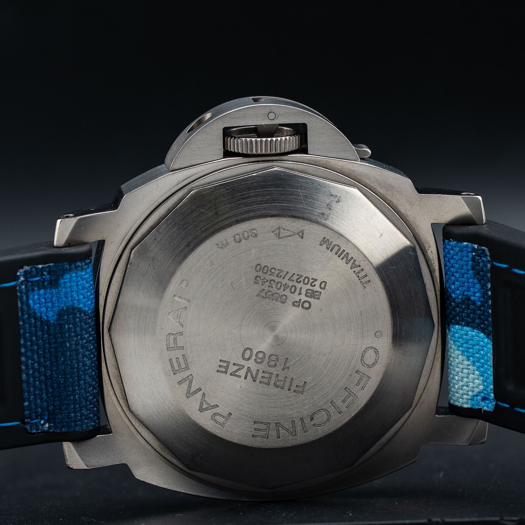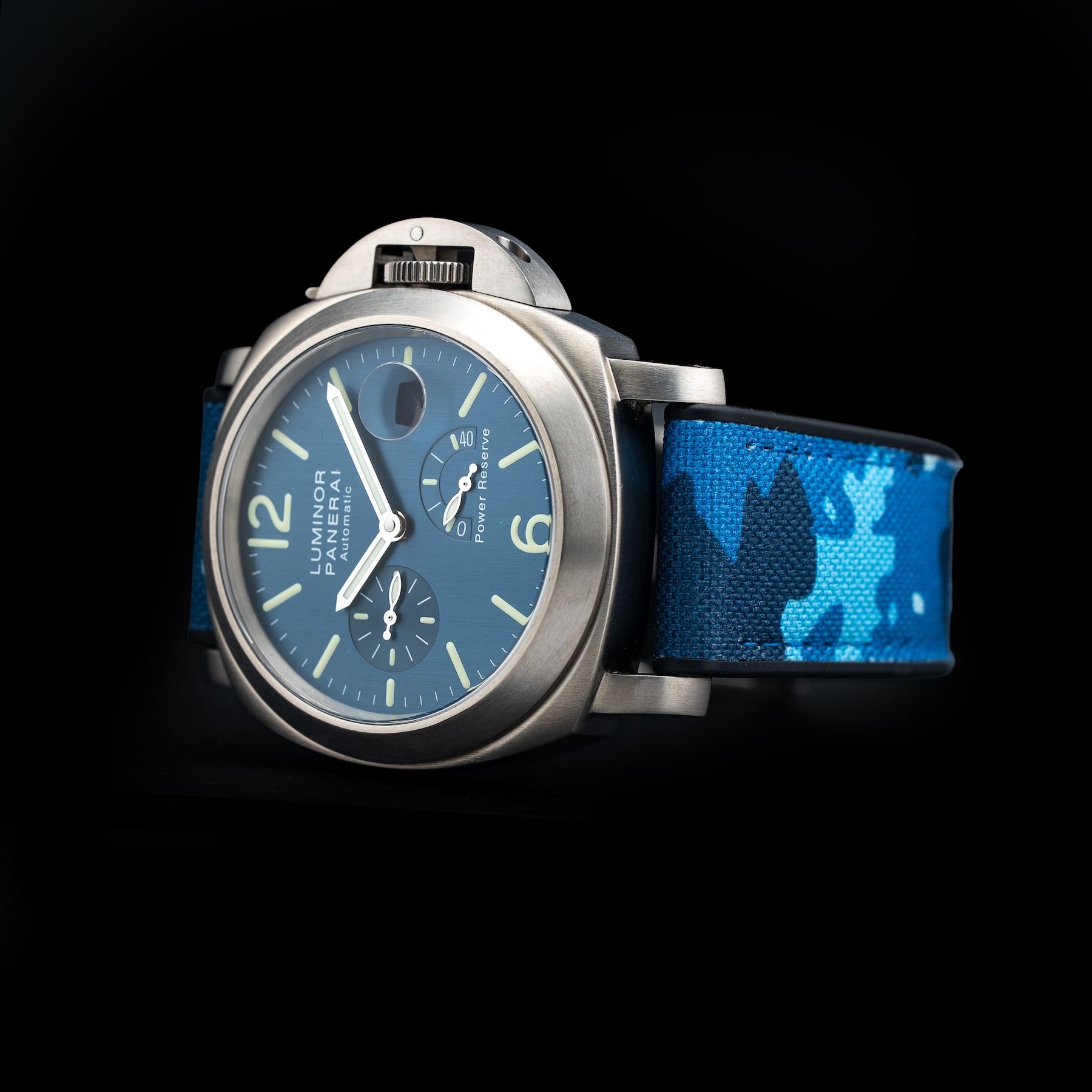 This watch features a 44mm titanium case on camo strap. This watch also sports a blue dial. Powered by an automatic movement. Water resistance up to 300 meters.
