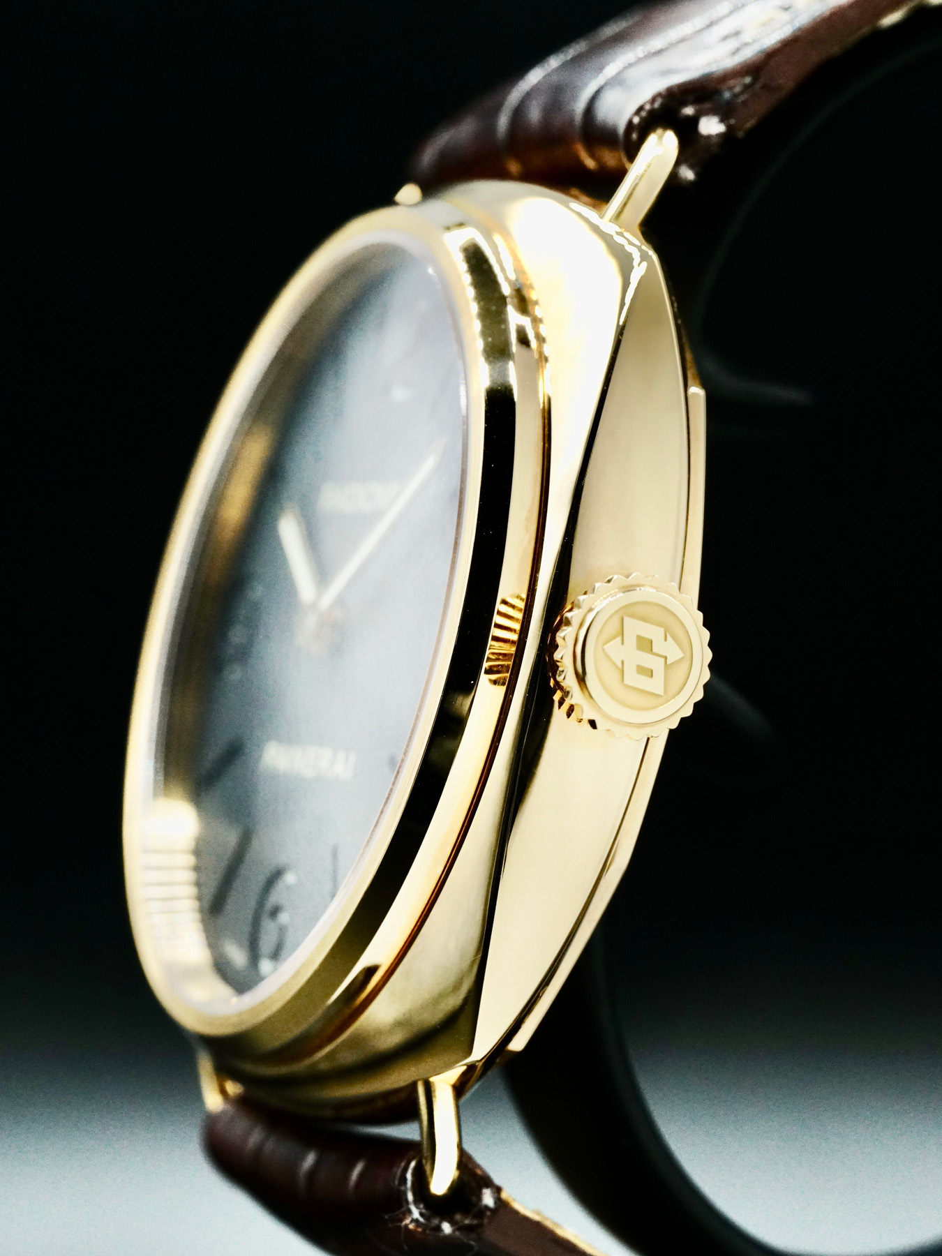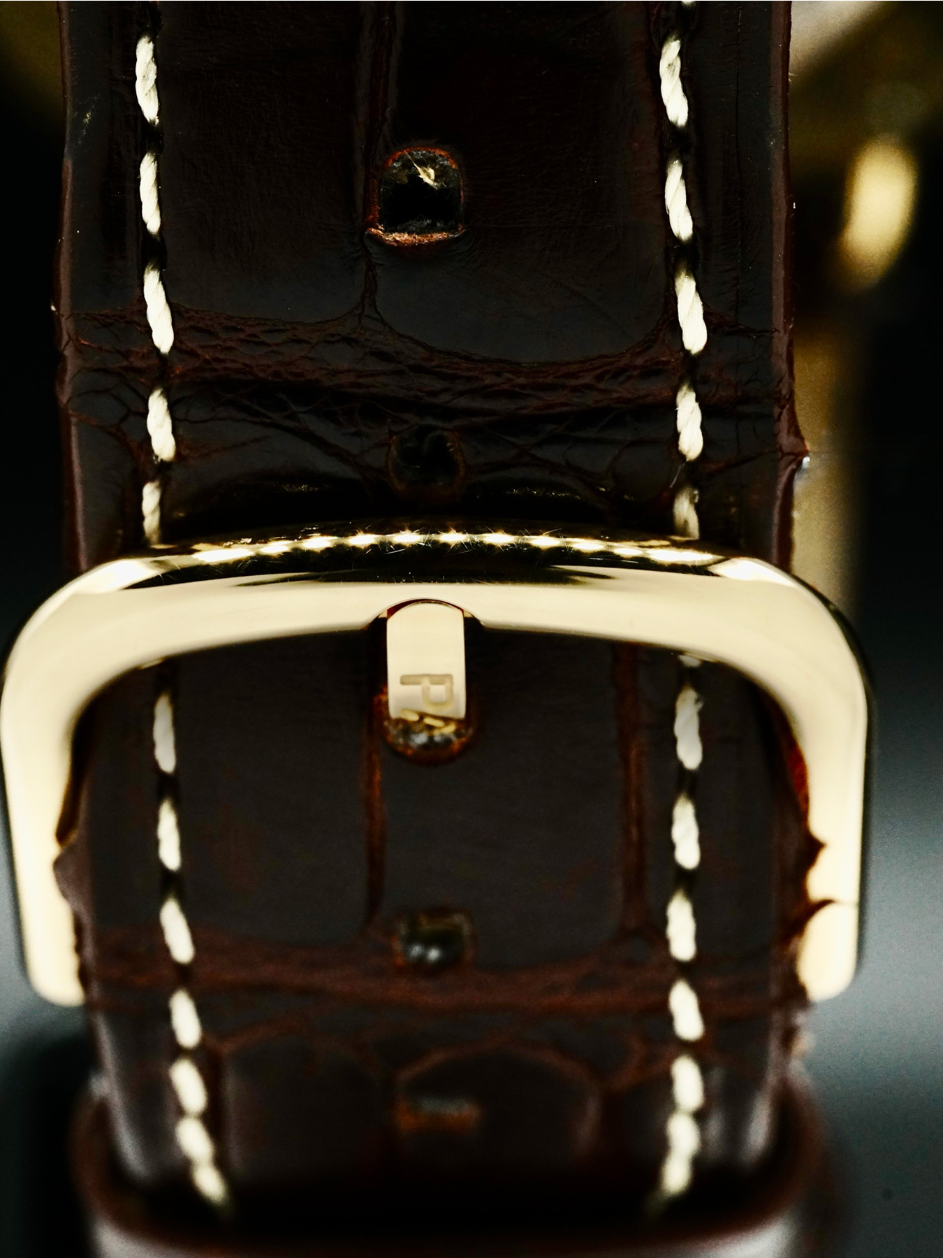 This watch features a 45mm 18k rose gold case on leather strap. This watch also sports a black dial. Powered by a mechanical manual movement. Water resistance up to 100 meters.