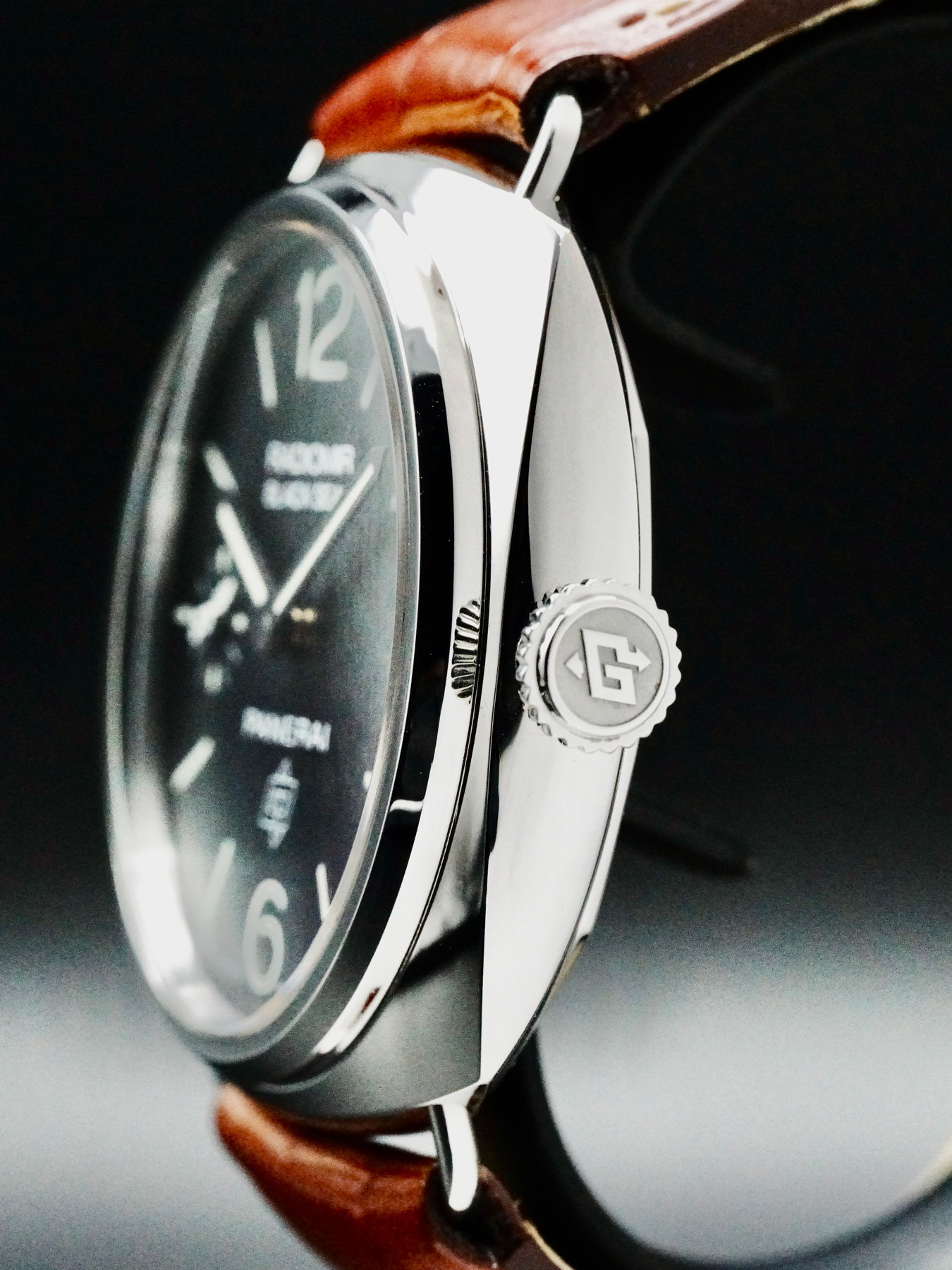 This watch features a 45 mm stainless steel case on leather strap. This watch also sports a black dial. Powered by a handwound movement. Water resistance up to 100 meters.