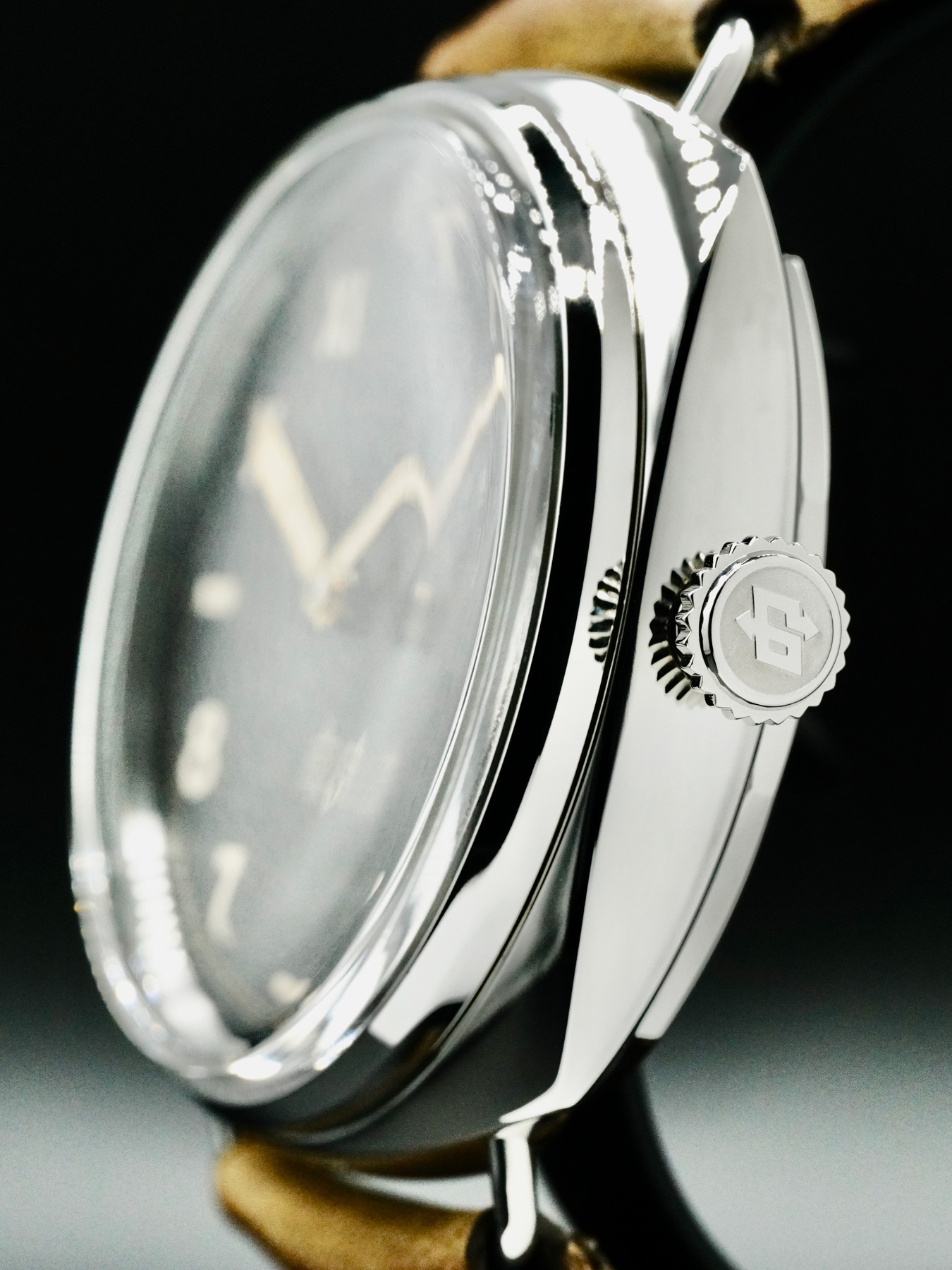 This watch features a stainless steel case with a brown leather strap. Tang clasp. Black dial. Water resistant up to 100 meters. Includes original box, papers, and guarantee certificate dated June 2013.
