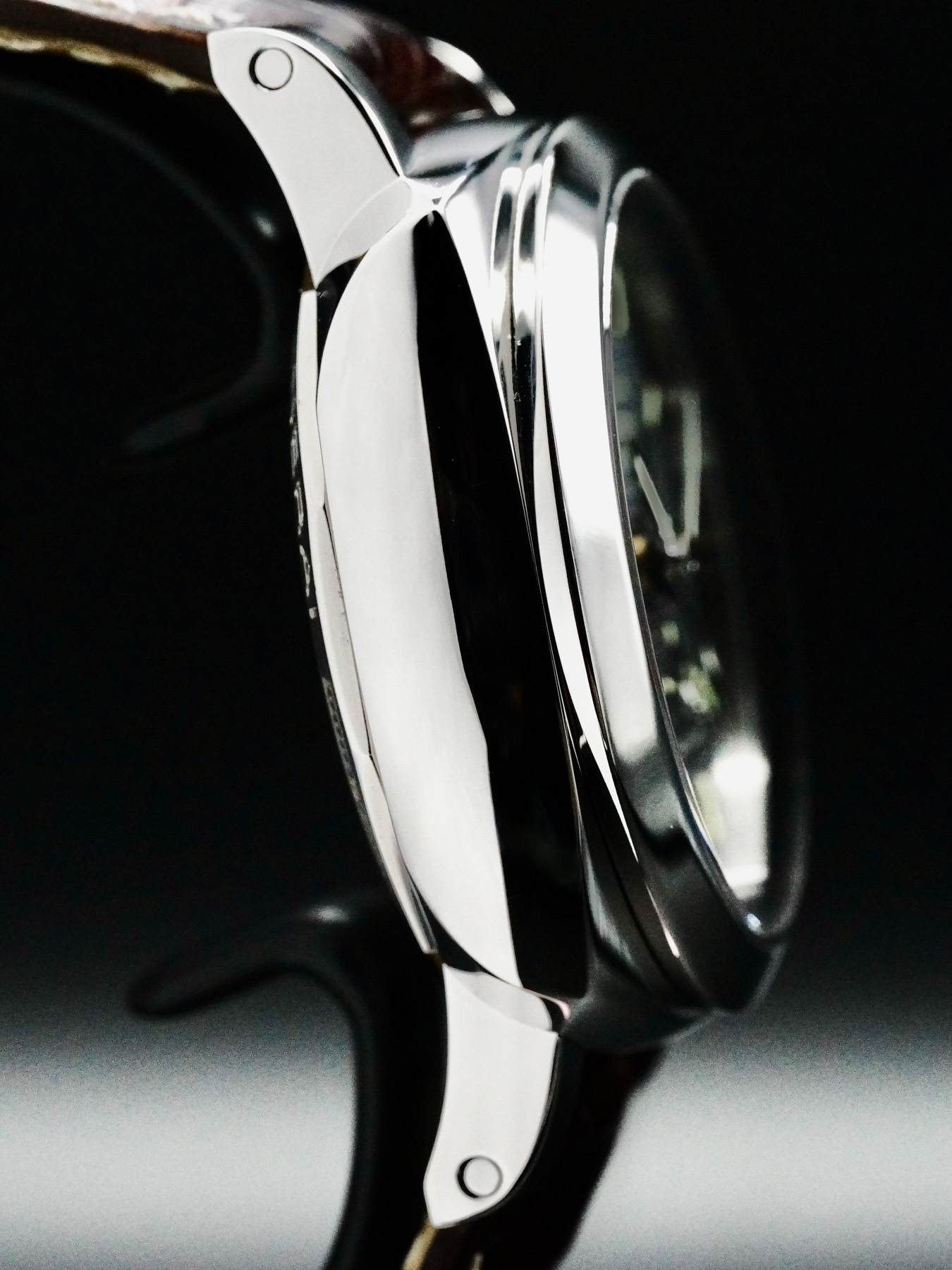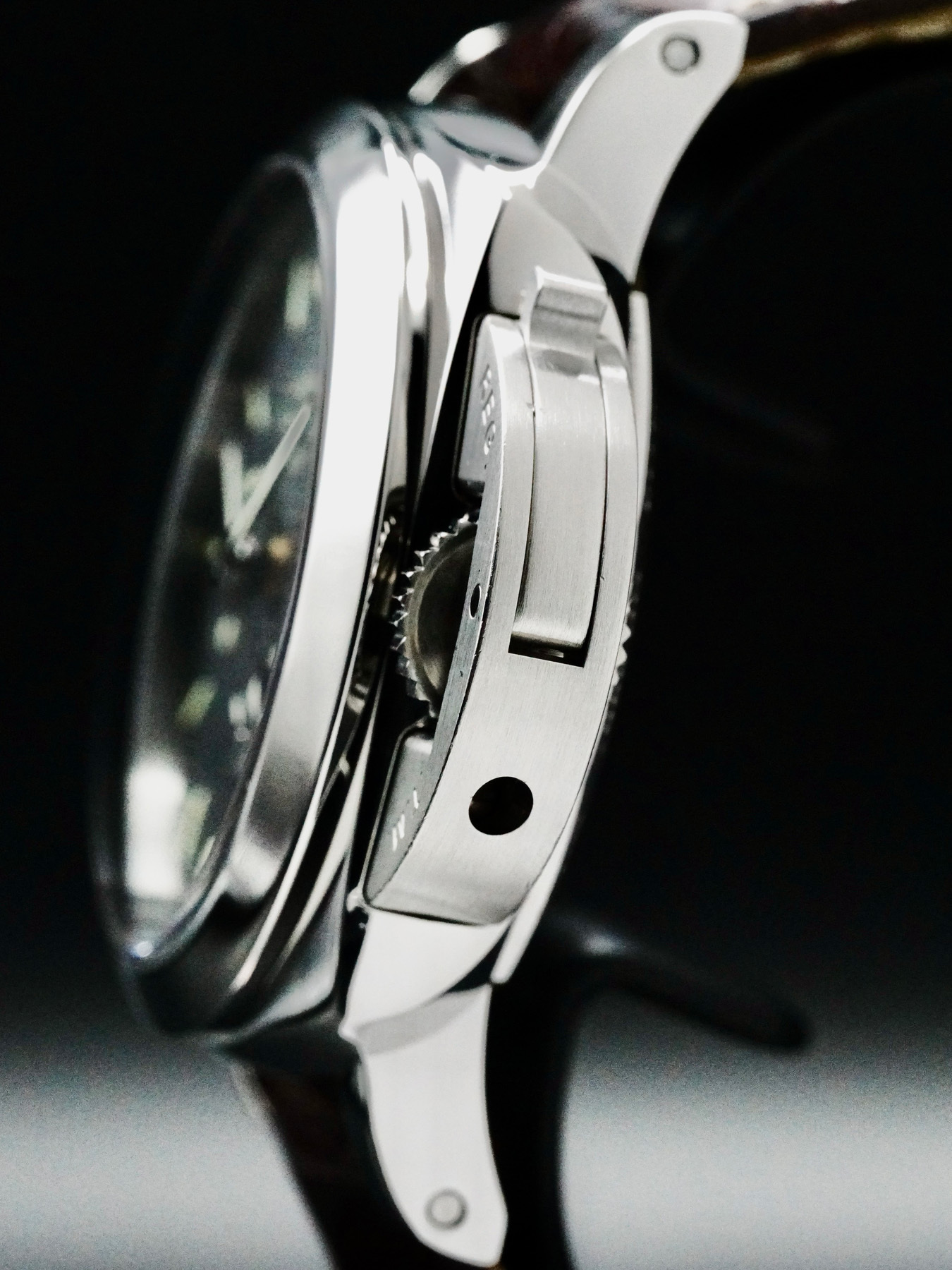 This watch features a 42mm steel case on leather strap. This watch also sports a black dial. Powered by a Mechanical Automatic Movement. Water resistance up to 300 meters.