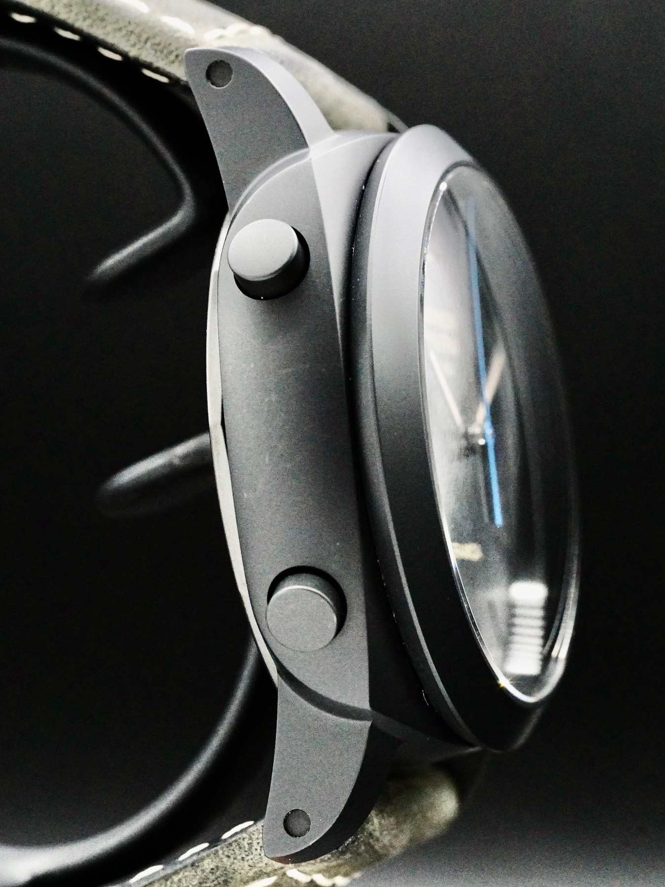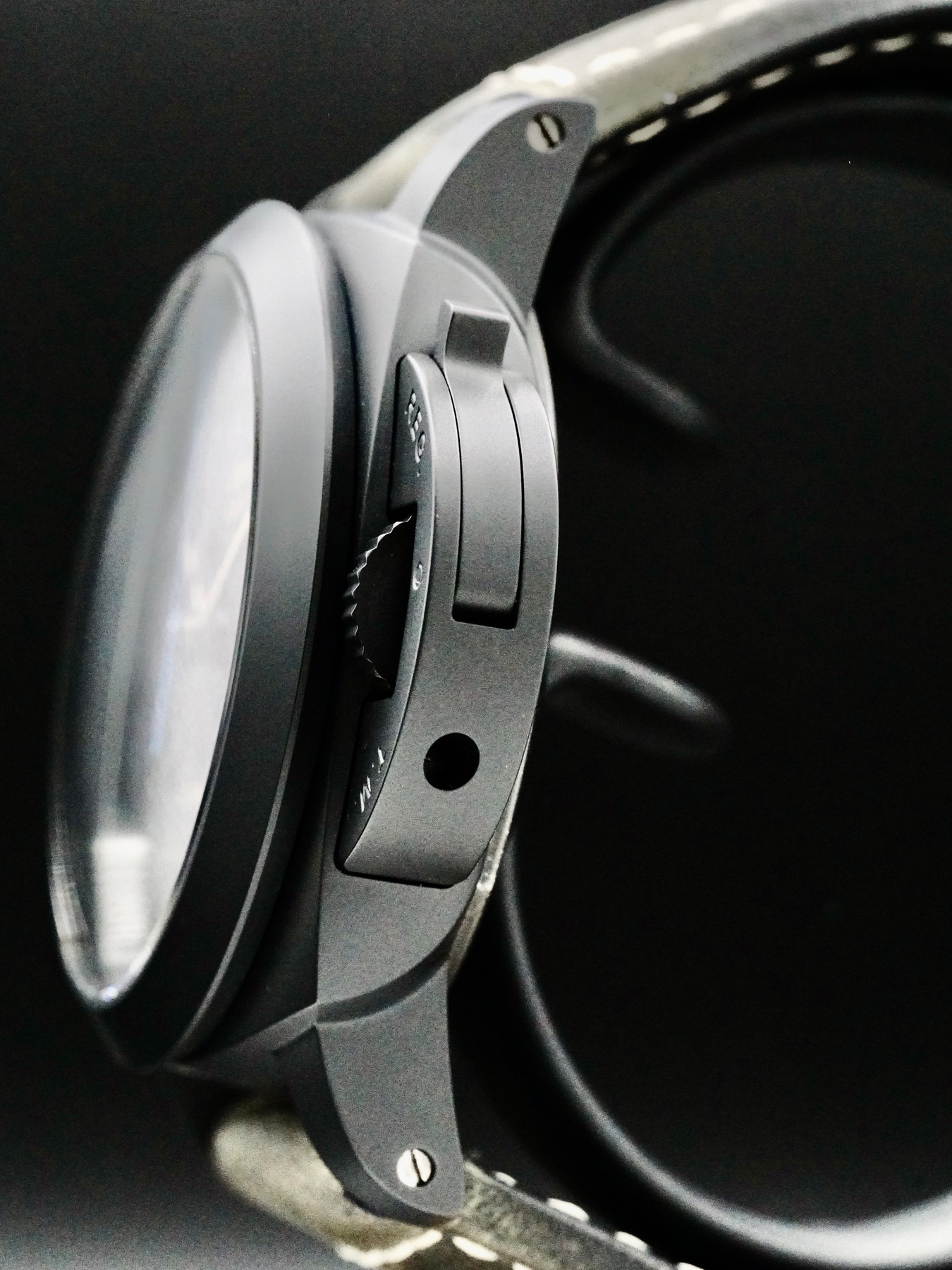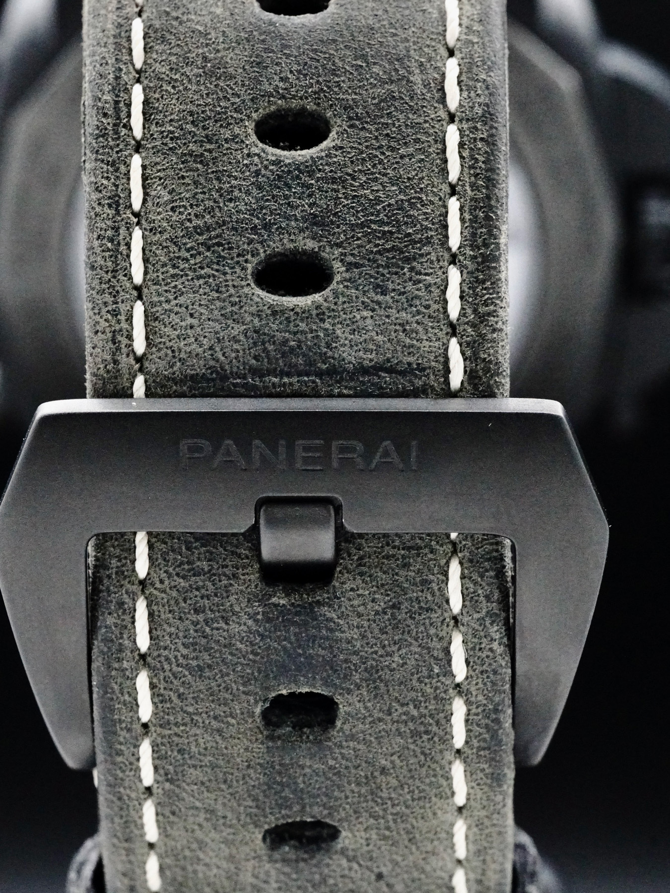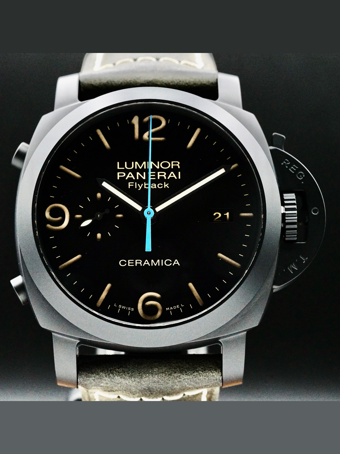 This Panerai Luminor 1950 3 Days features a 44mm ceramic case with a display case back on a grey leather strap. This watch also sports a black dial with luminous hands and index dial markers covered by sapphire crystal.