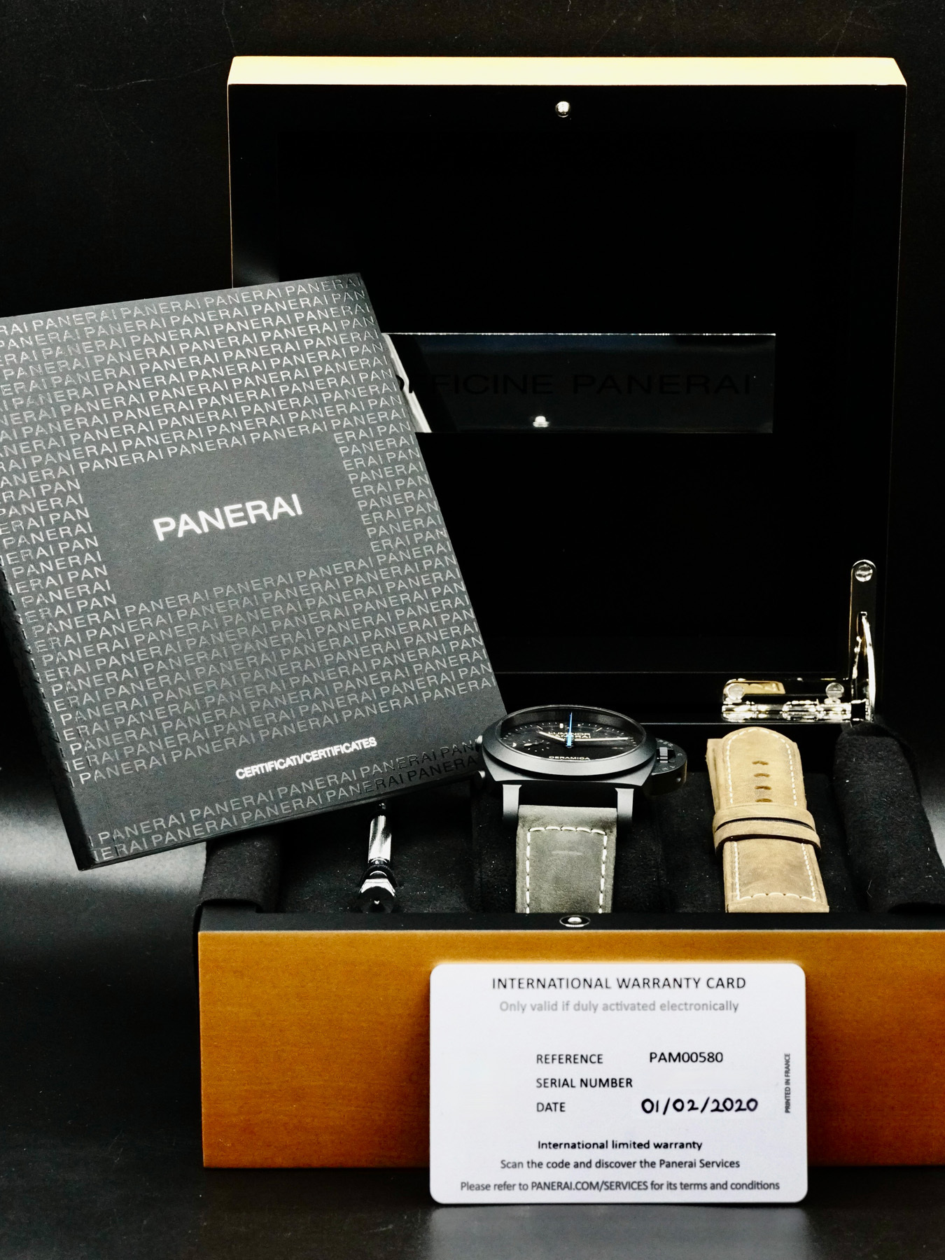 This Panerai Luminor 1950 3 Days PAM00580 is in EXCELLENT condition. This watch includes its original box and international warranty card dated for January 2020. Extra brown leather strap.