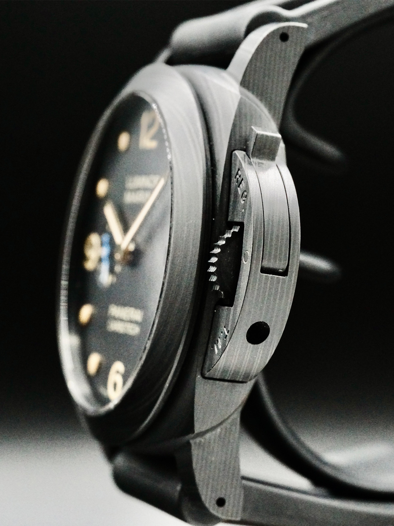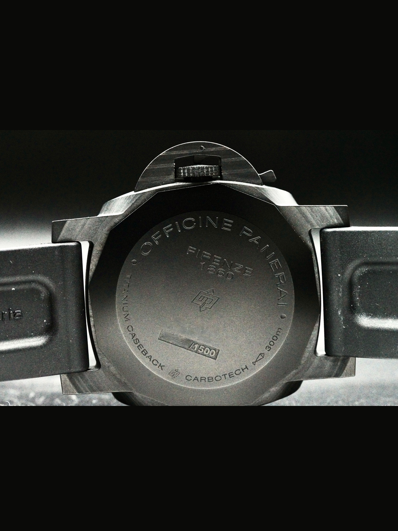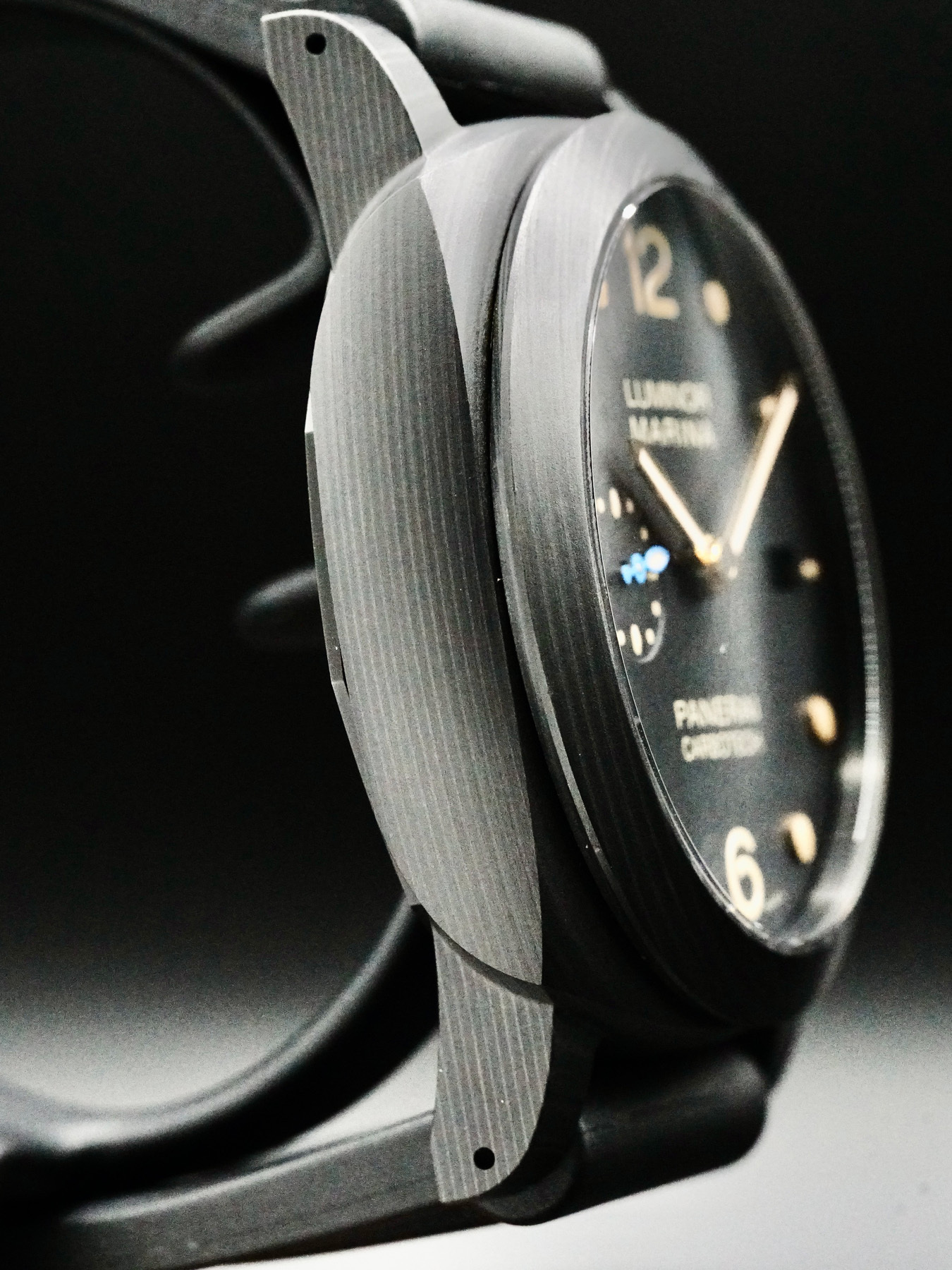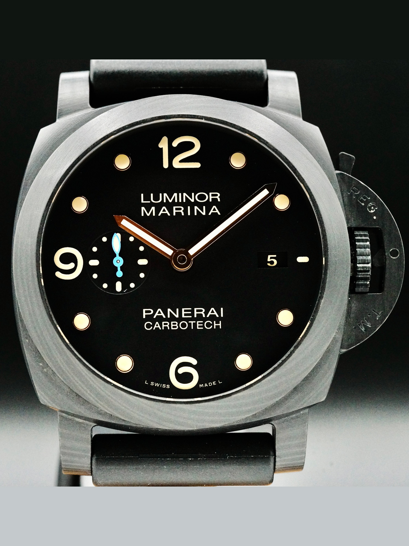 This Panerai Luminor Marina Carbotech features a 44mm Carbotech case with a solid case back on a black rubber strap. This watch also sports a black dial with luminous hands and index dial markers covered by scratch resistant sapphire crystal.