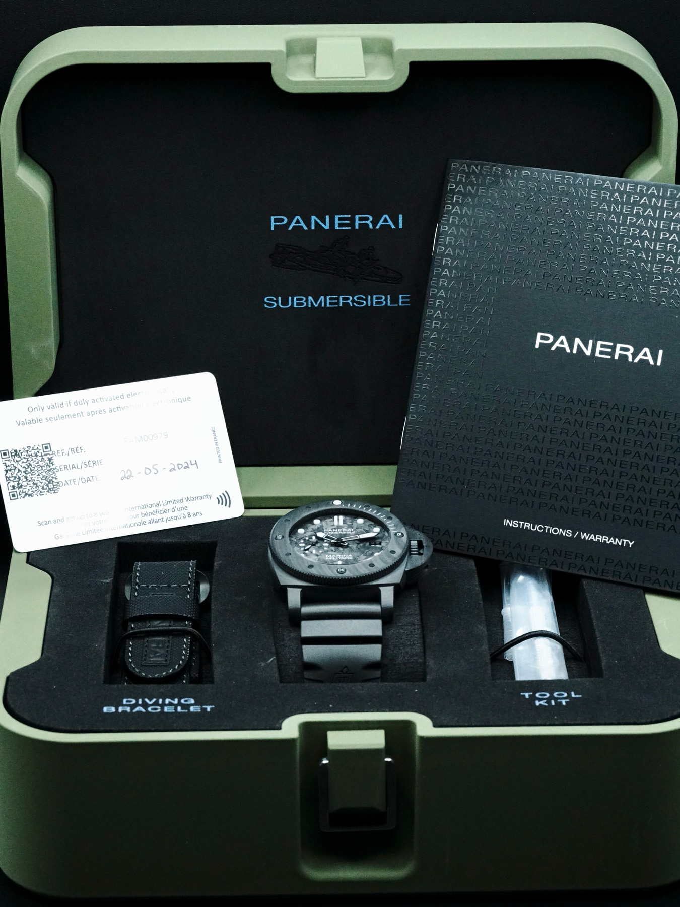 This Panerai Luminor Submersible Marina Militare Carbotech PAM00979 is in UNWORN condition. This watch includes its original box, instructions, and warranty card dated for 2024. Extra black textile strap. This watch has been fully authenticated and certified by Exquisite Timepieces.