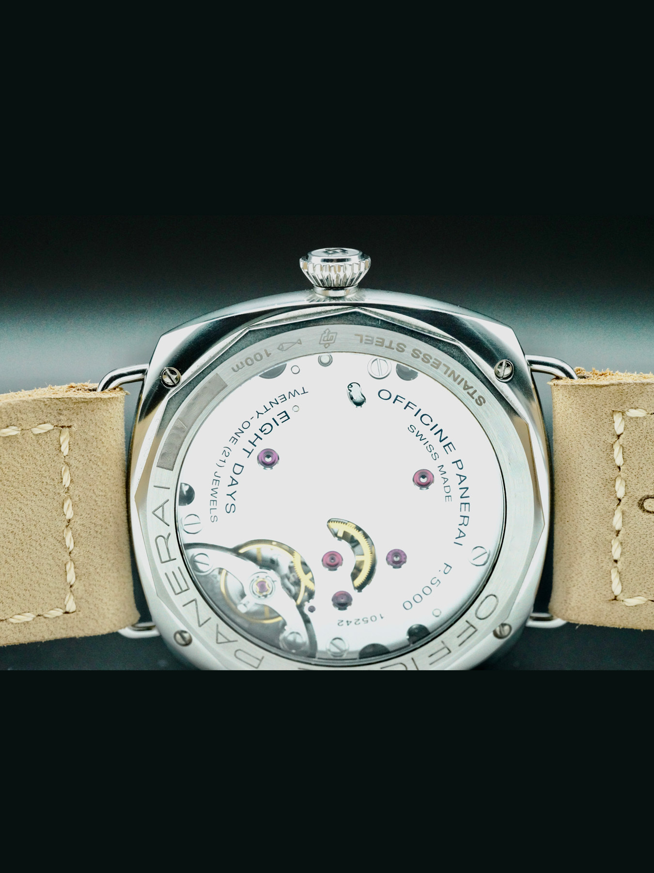 Hand-wound Movement powered by Panerai Calibre P.5000 with a power reserve of approximately 192 hours (8 days). Water resistance up to 100 meters.