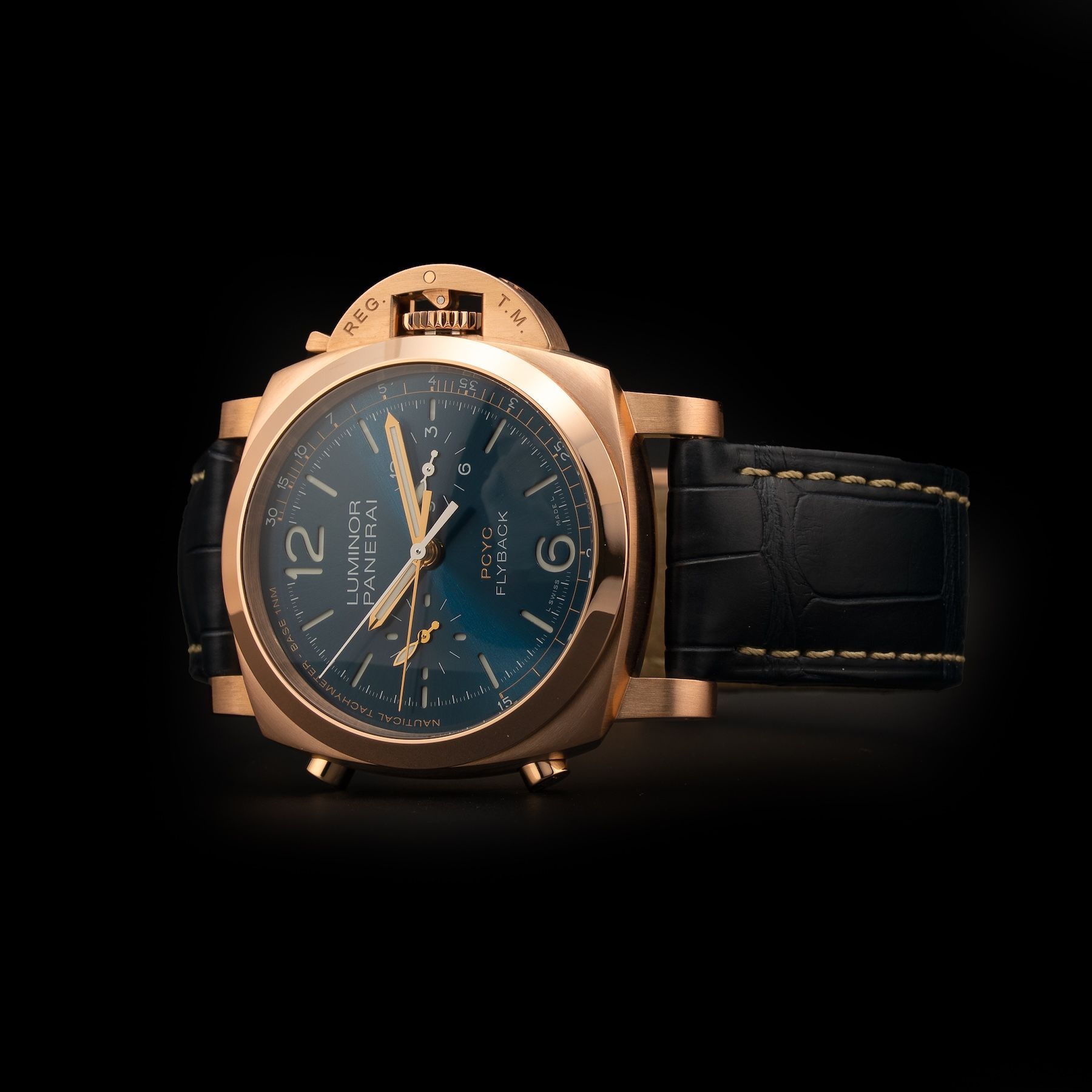 This watch features a 44mm red gold case on leather strap. This watch also sports a blue dial. Powered by a chrono flyback automatic movement. Water resistance up to 100 meters.