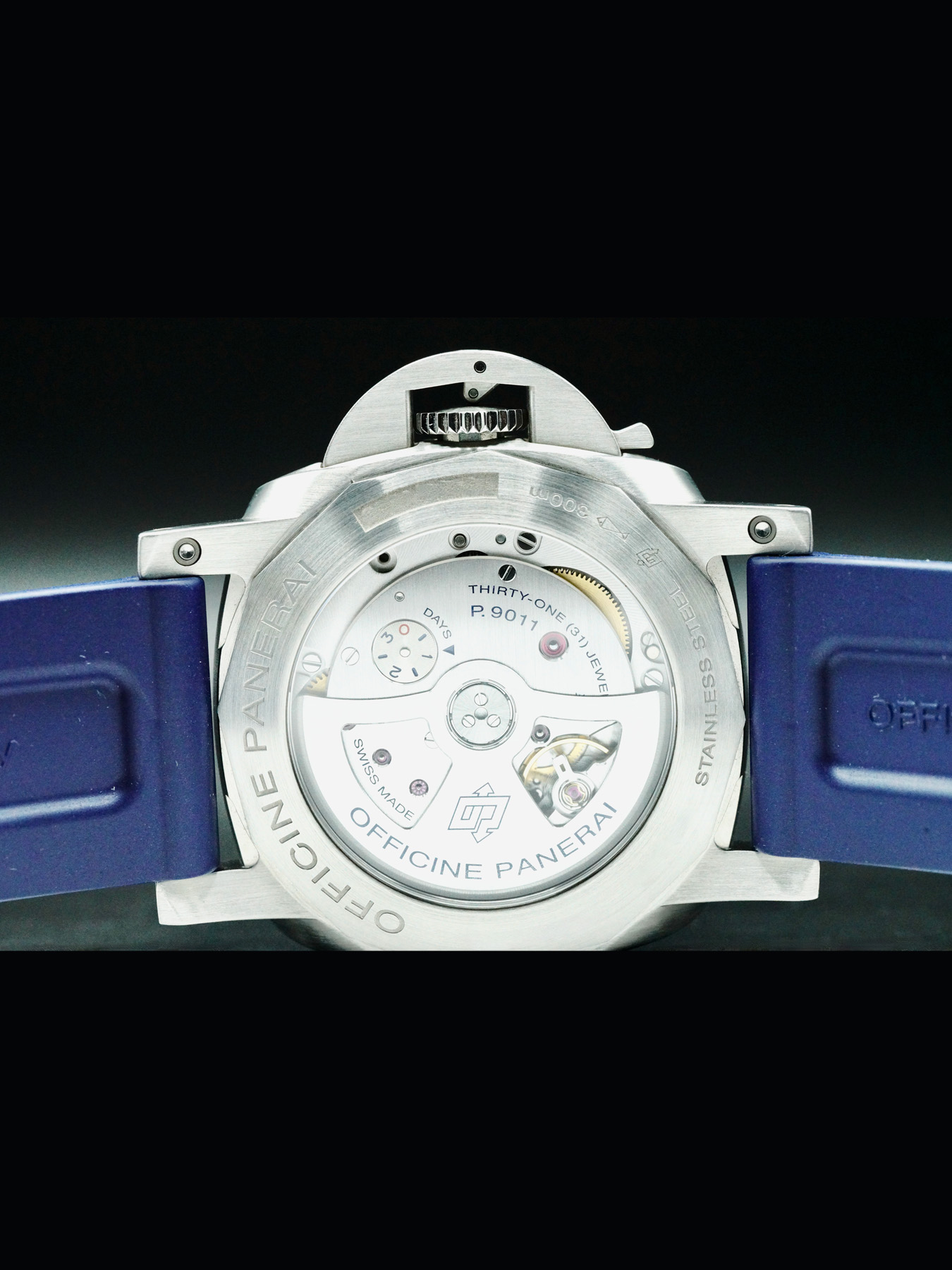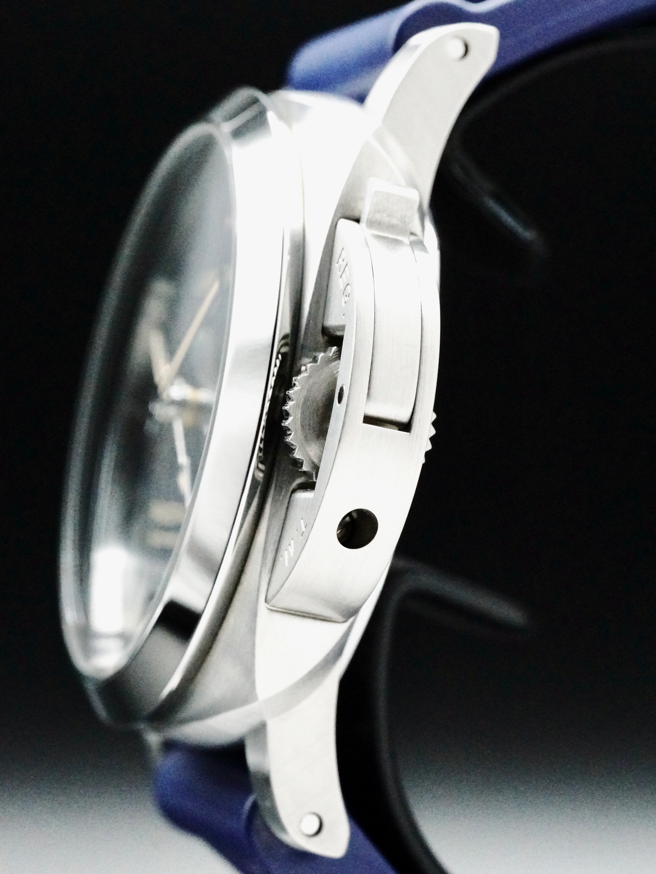This watch features a 44 mm stainless steel case on rubber strap. This watch also sports a blue dial. Powered by a mechanical automatic movement. Water resistance up to 300 meters.